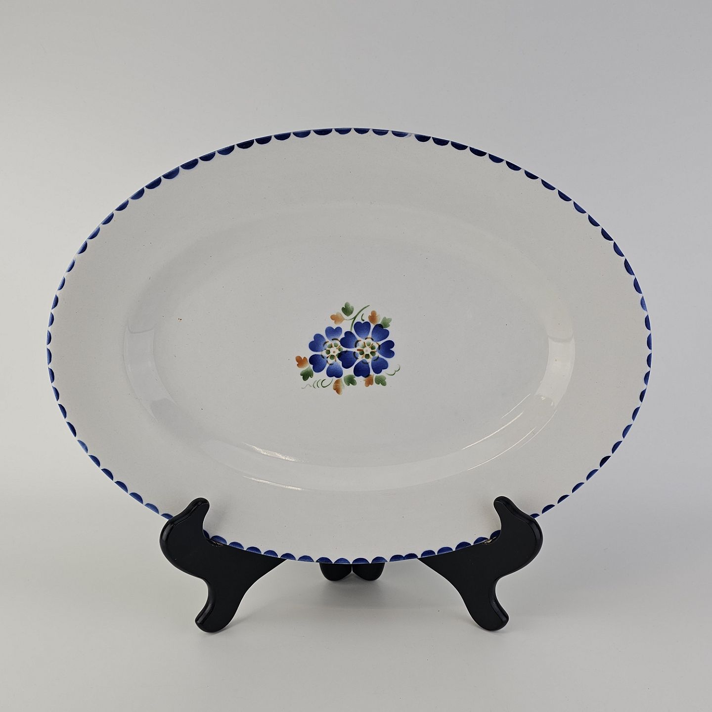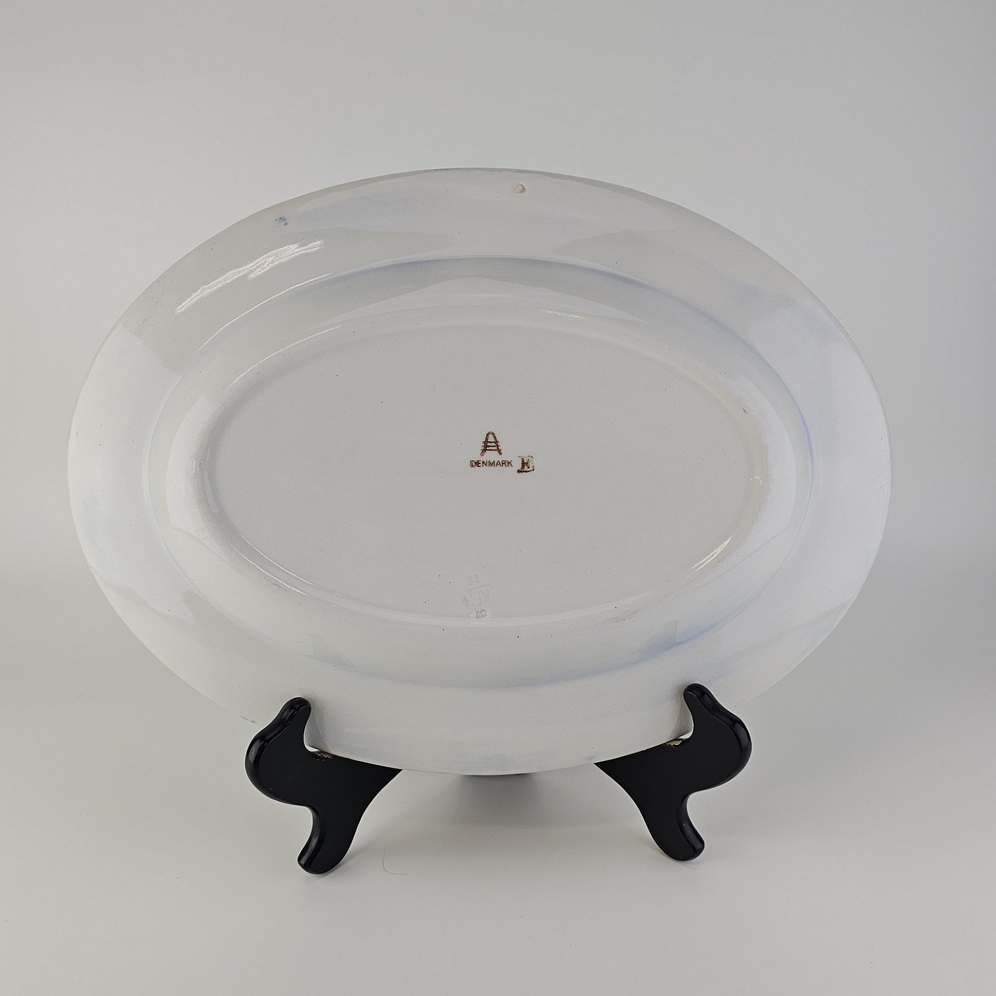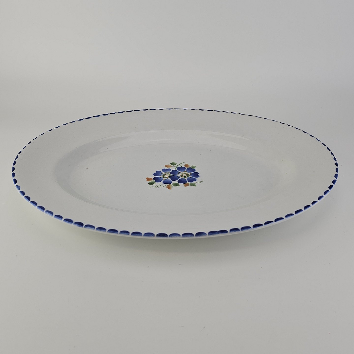 Ovalt fad i fajance fra stellet Geranium II fremstillet i perioden 1927-1940.