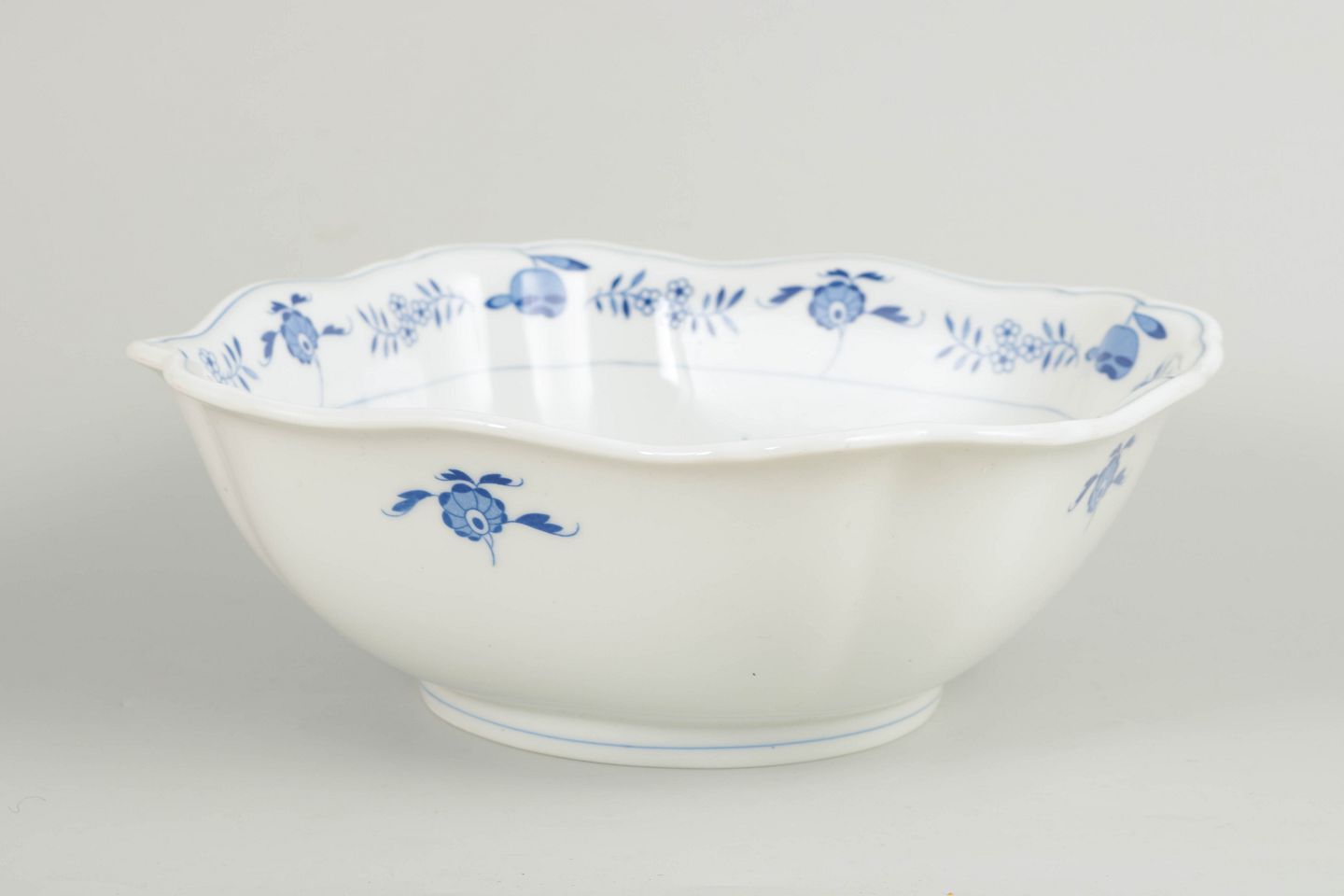 Stor skål i håndmalet porcelæn med Blå Orkidé dekoration. Fremstillet hos Meissen og mærket med Meissens krydssværd. Annulleret med to indridsede streger under bunden.