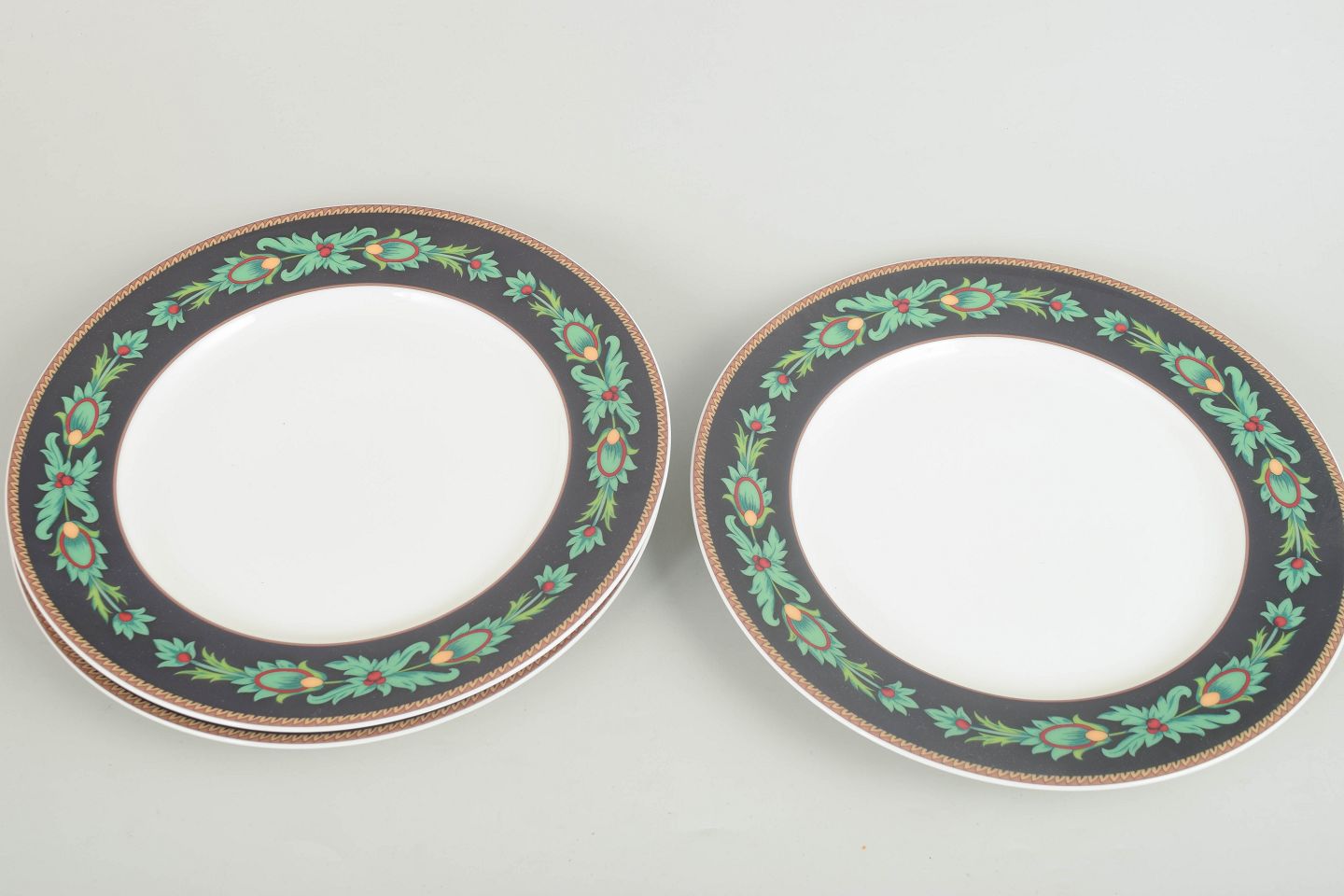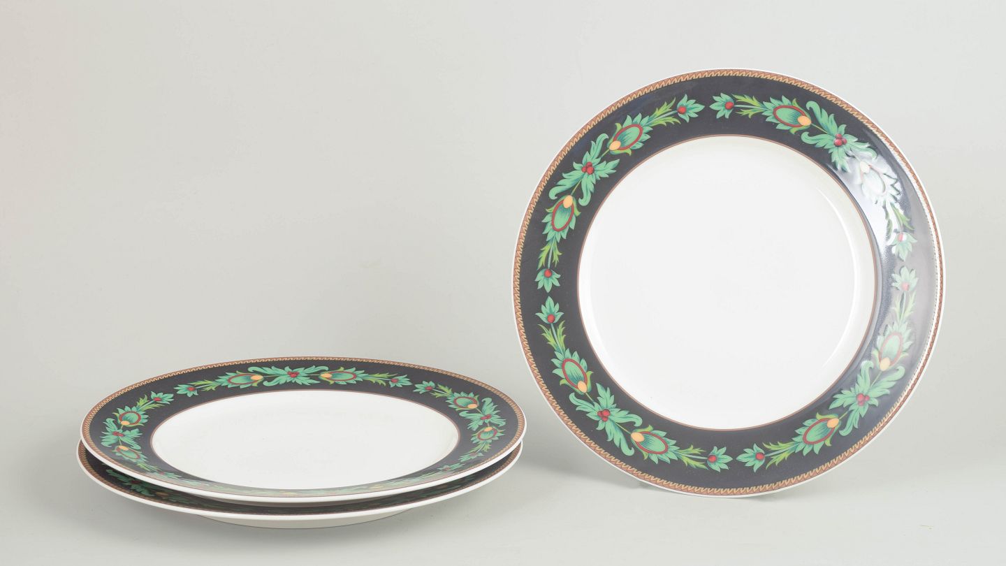 Sæt af tre middagstallerkener i porcelæn med dekorativ bort i grønne og gyldne nuancer mod mørk baggrund. Tallerkenerne er fremstillet hos Rosenthal efter design af Nina Campbell.