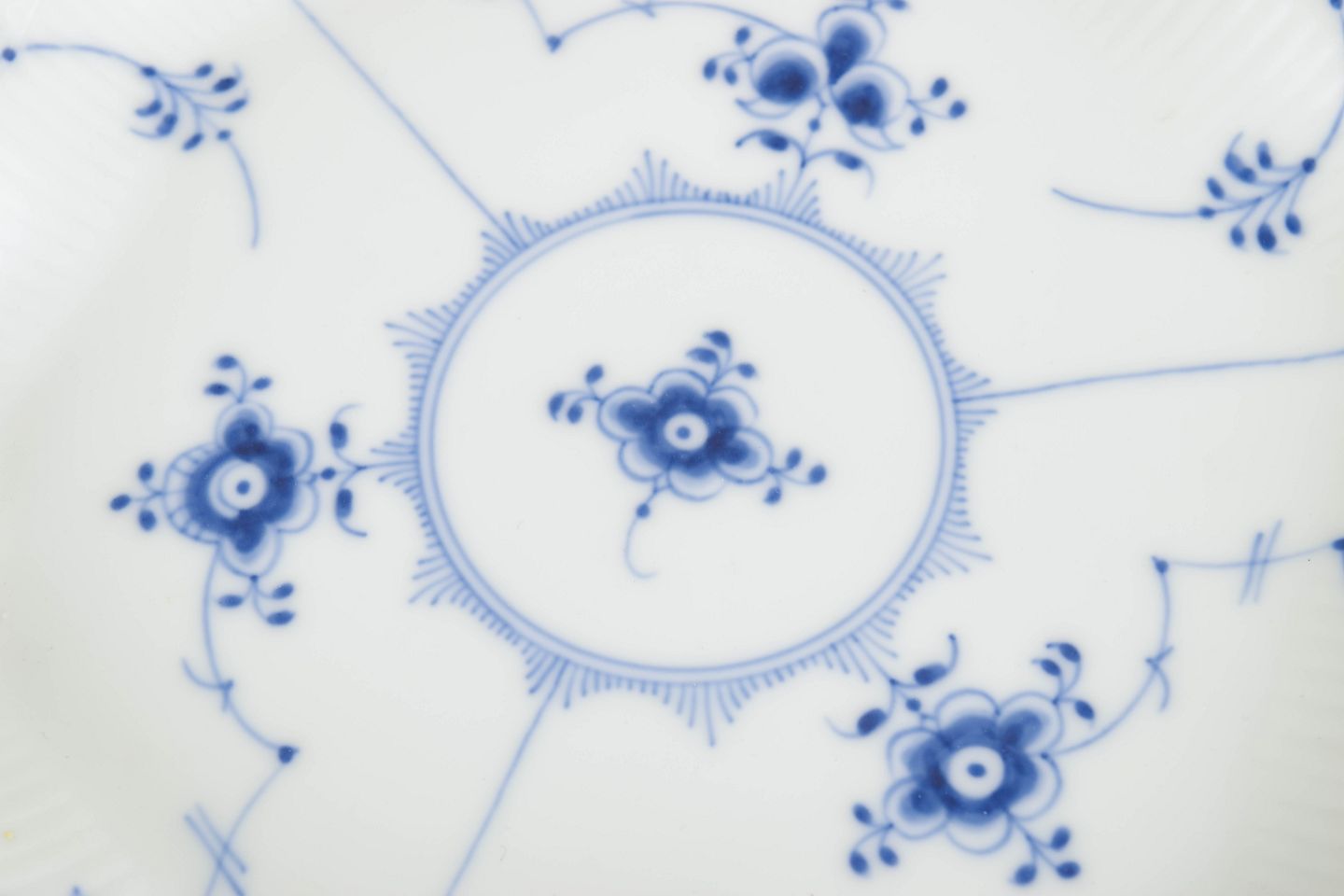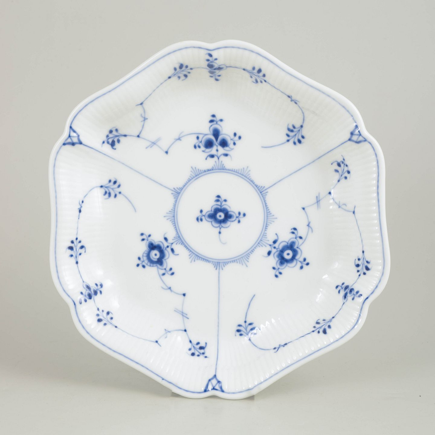 Sjældent fad i håndmalet porcelæn fra Musselmalet Riflet med klassisk underglasurdekoration i koboltblå og riflede felter. Model 1/2195. H. 4 cm, D. 23 cm. Annulleret med én indridset streg under bunden. Fremstillet i 1920’erne.