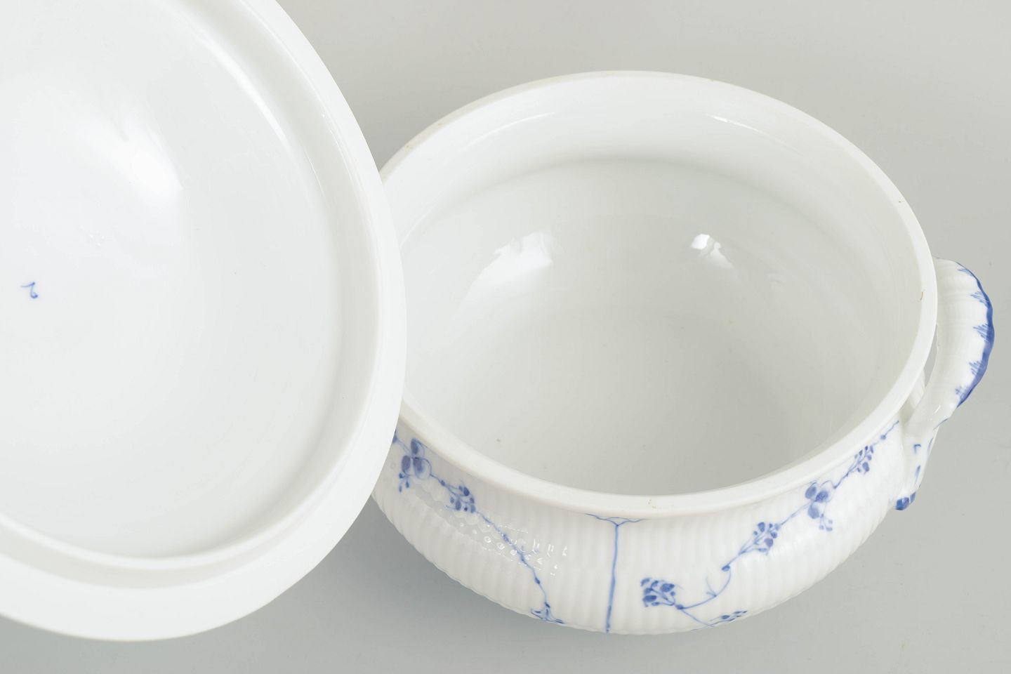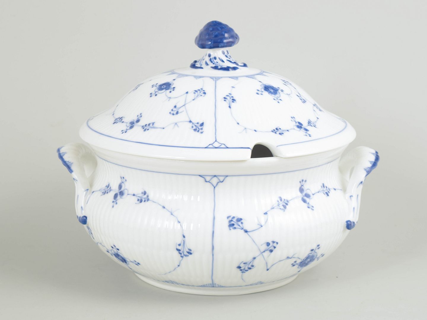 Stor suppeterrin med låg i håndmalet porcelæn fra Musselmalet Riflet med klassisk underglasurdekoration i koboltblå og riflede felter. Model 1/222. H. 23 cm, D. 26 cm. Første sortering. Fremstillet omkring 1900.