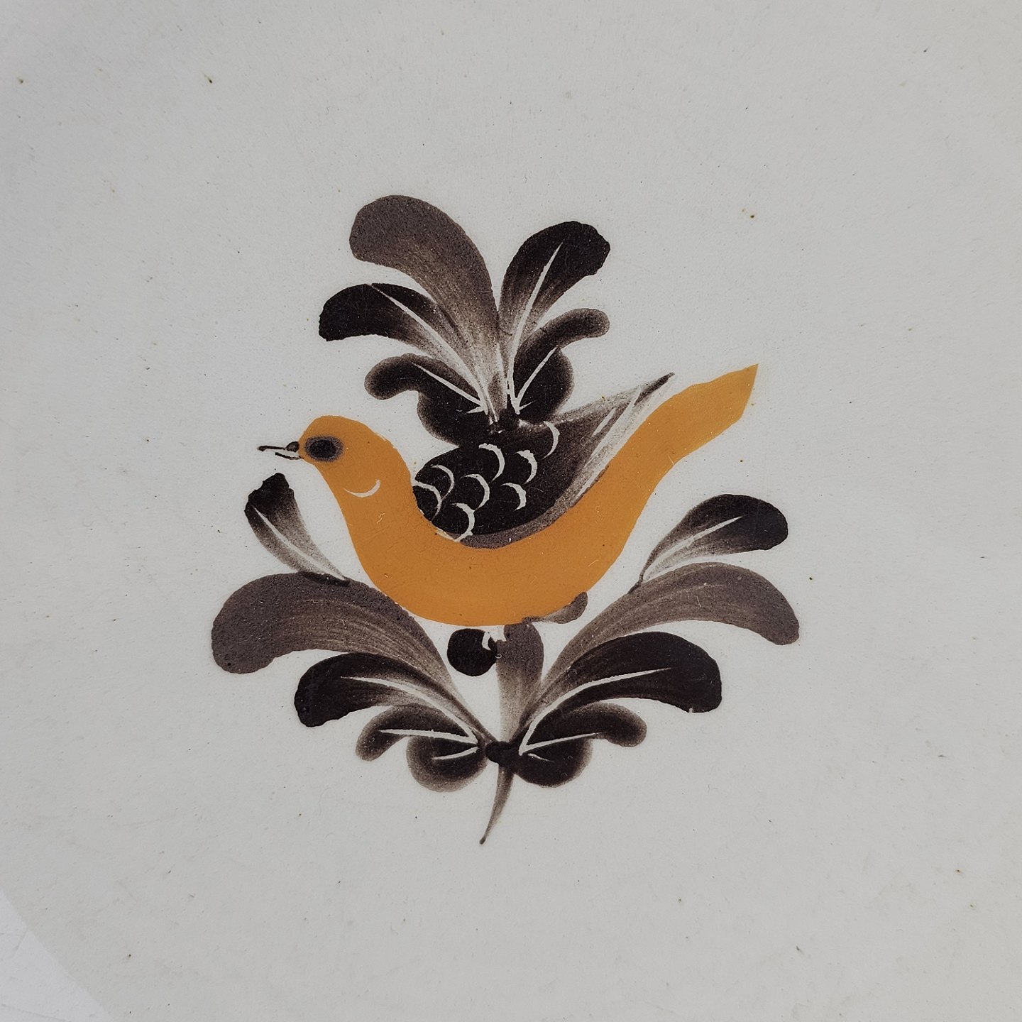 Hvidt fajancestel i stelform G med motiv af en orange og brun fugl og kant.