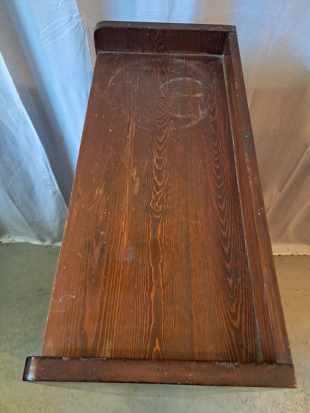 Reol i massivt bejdset og lakeret fyrretræ, fra 1950erne.