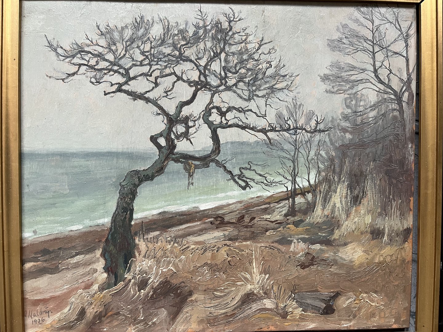 Maleri af Aksel Haldrup 1926 - Nøgent træ ved vandkant.