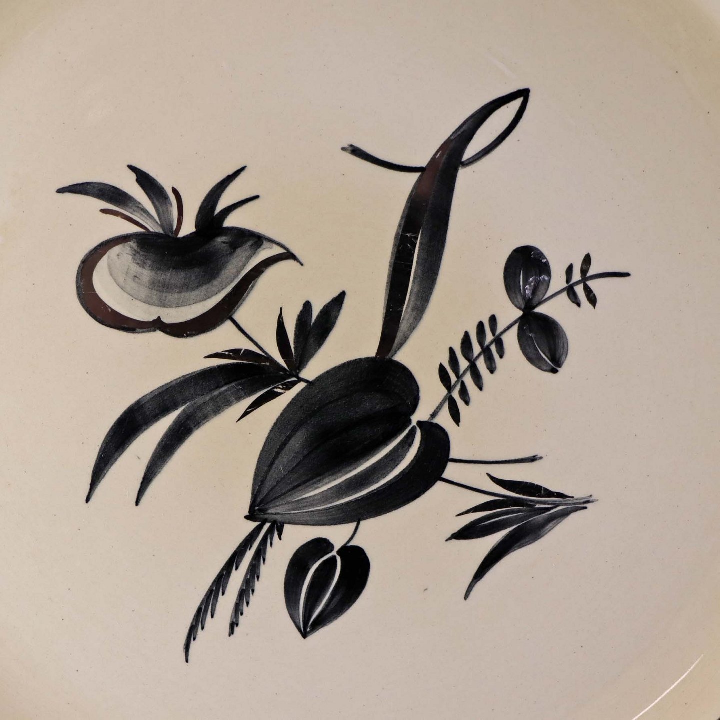 Råhvidt fajancestel i stelform E med dekoration af naturmotiver i sølv og sort farve.