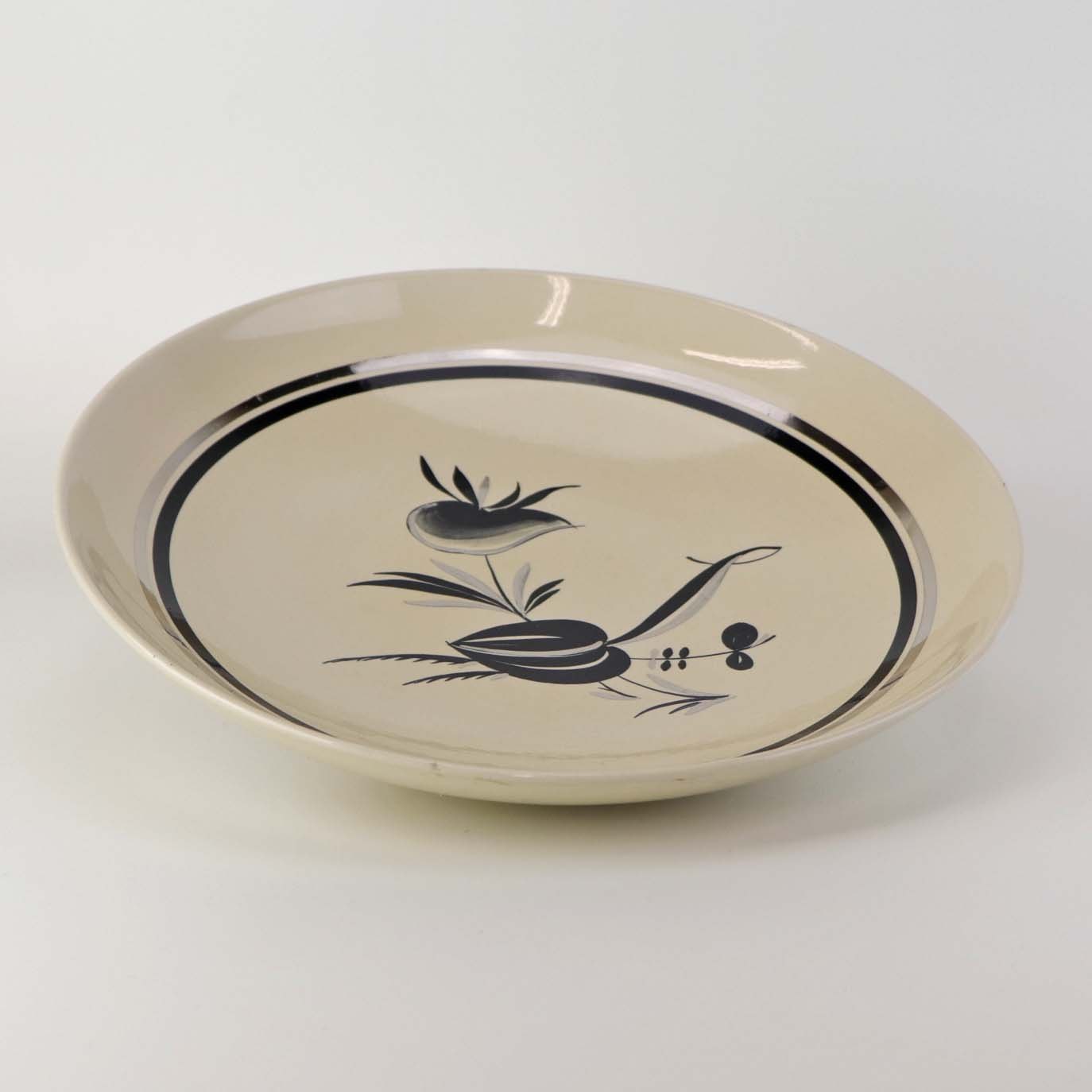 Råhvidt fajancestel i stelform E med dekoration af naturmotiver i sølv og sort farve.