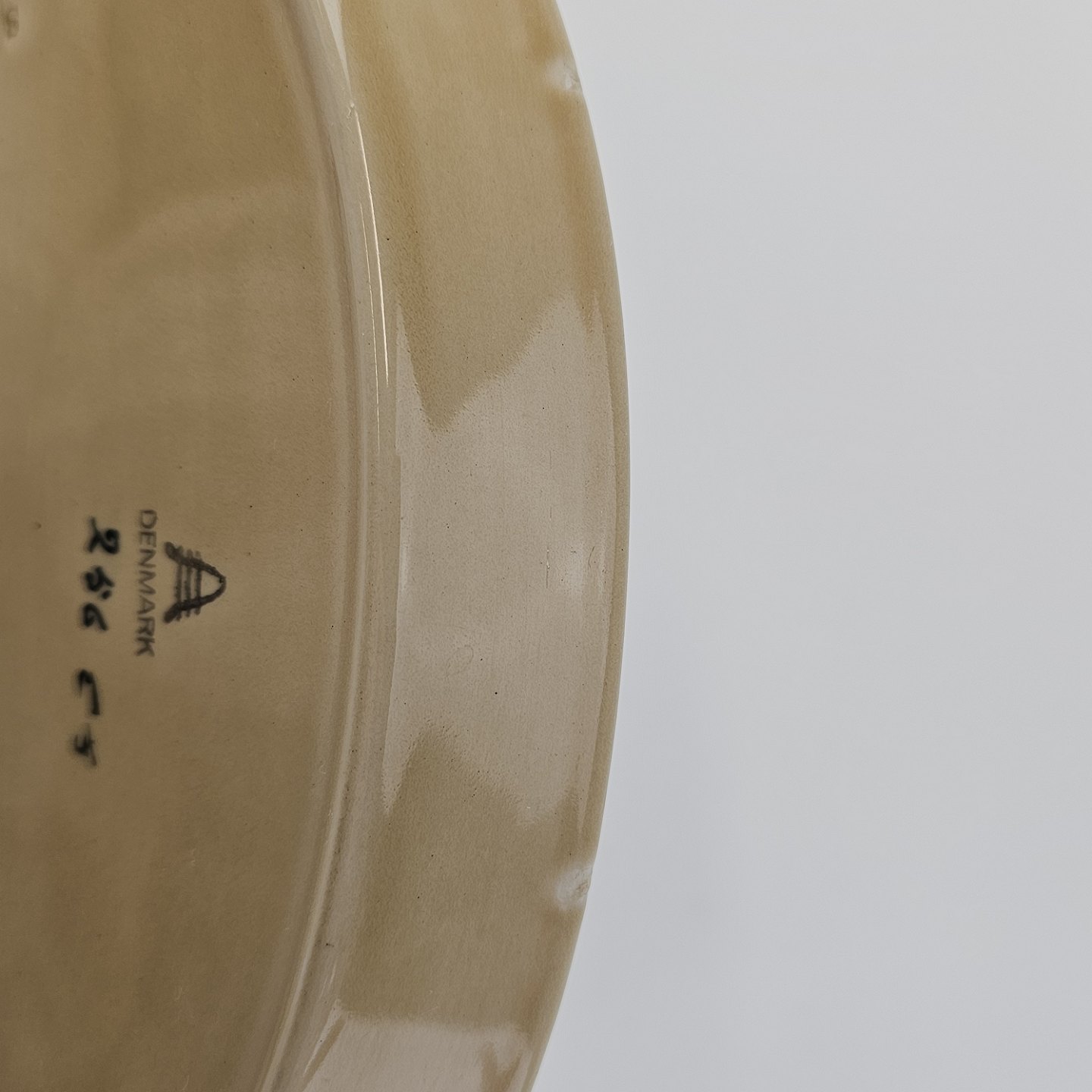 Aflangt ovalt fad i fajance fra stellet Dragsholm fremstillet i perioden 1934-1965.