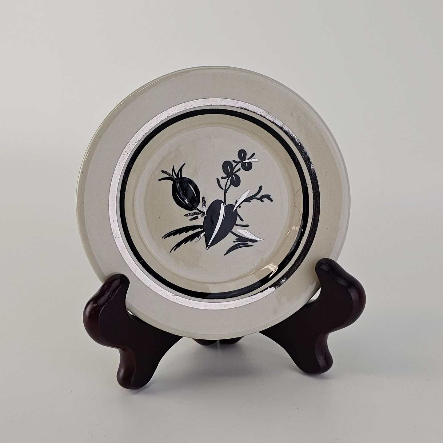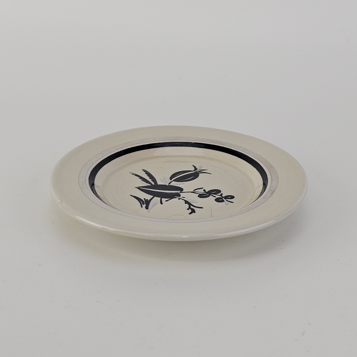 Råhvidt fajancestel i stelform E med dekoration af naturmotiver i sølv og sort farve.
