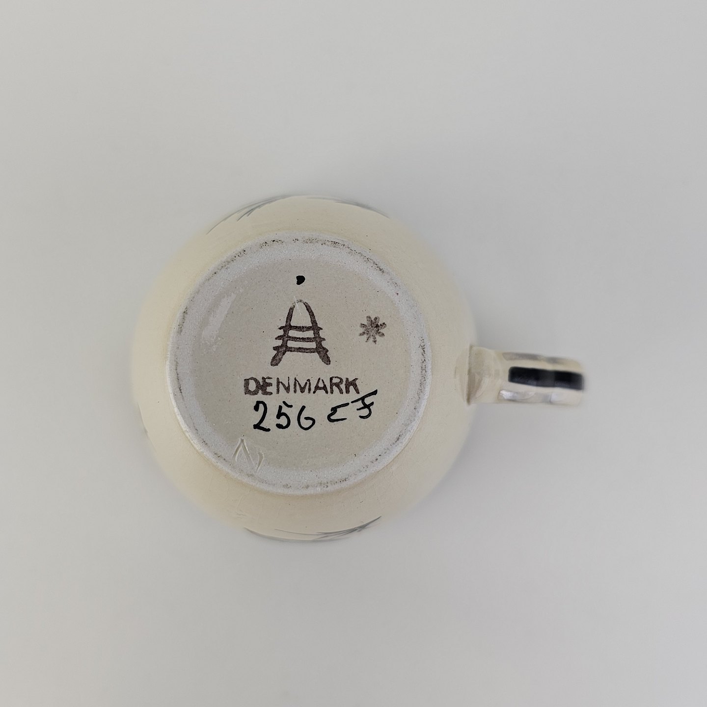 Kop med underkop med art nouveau hank i fajance fra stellet Dragsholm fremstillet i perioden 1934-1965.