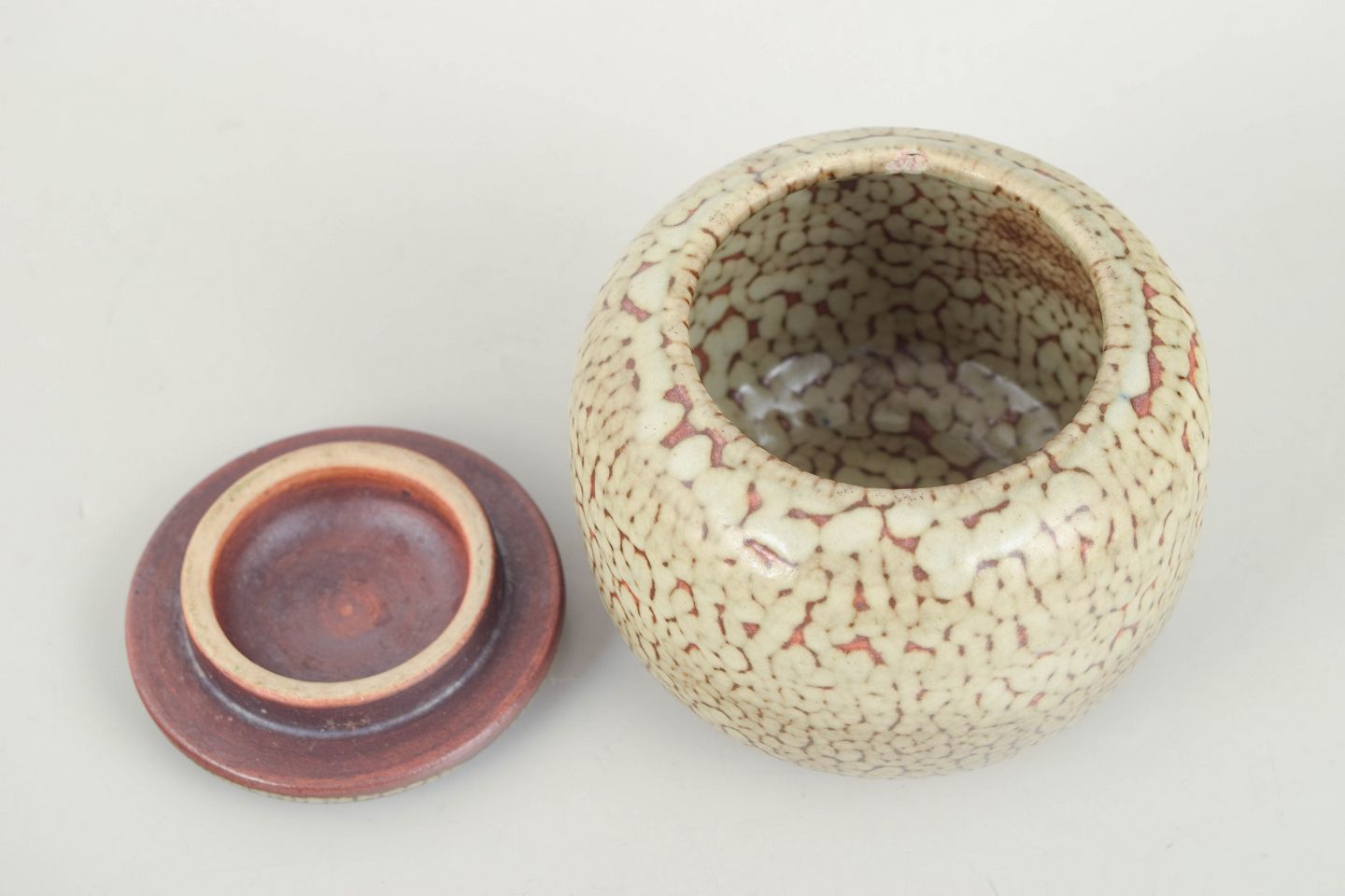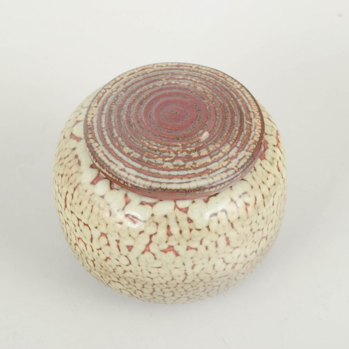Tidlig lågkrukke i stentøj med rundet korpus og fladt låg. Glasur i cremefarvet nuance med fint krakeleret mønster og varm, rødlig kant langs låg og fod.