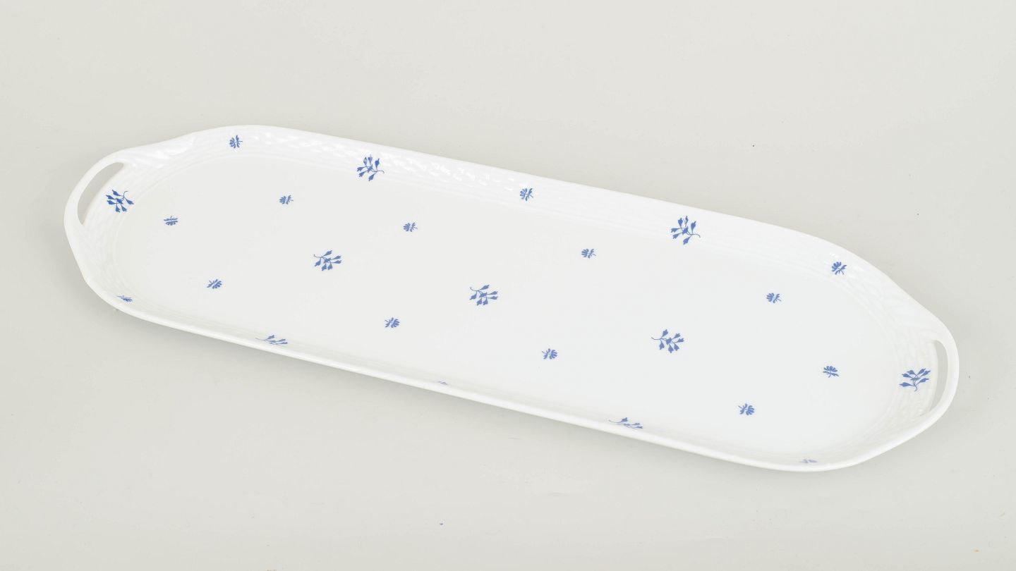 Imponerende og elegant ovalt porcelænsfad fra Herend, udført med raffineret håndmalet dekoration og fin forgyldning langs randen. Fadet fremstår med klassisk proportionering og balanceret form, typisk for fabrikkens produktion i mellemkrigstiden. Et repræsentativt og dekorativt serveringsfad fra 1930’erne.