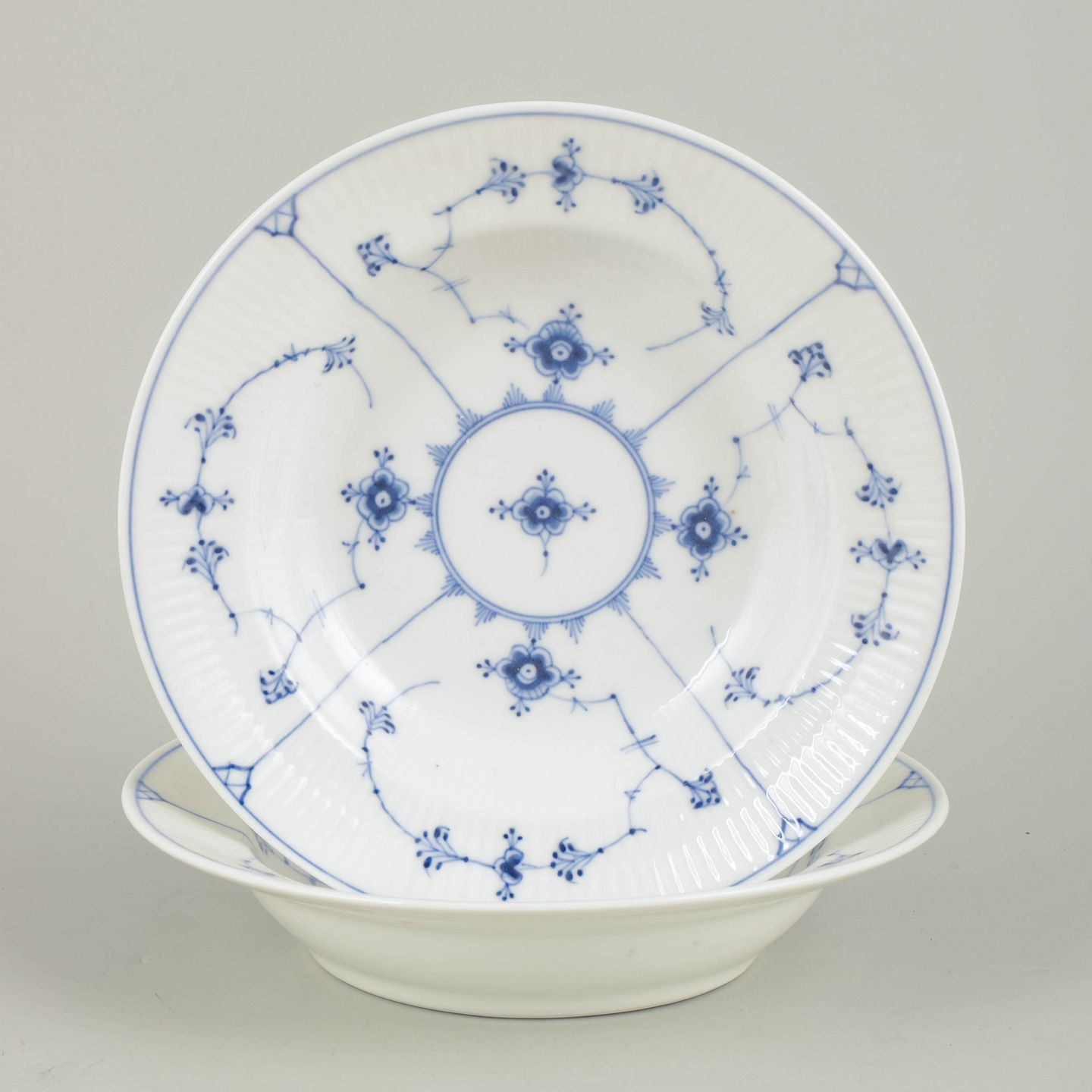 To håndmalede dybe tallerkener i Musselmalet Riflet dekoration, model 1/167, fra 1920’erne. Første sortering.