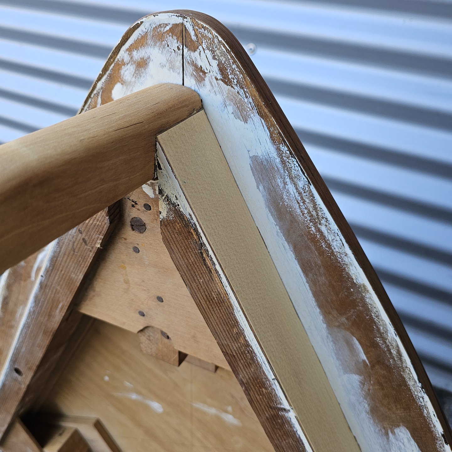 Fremstår med brugsspor på stellet og rester af maling på undersiden af bordpladen