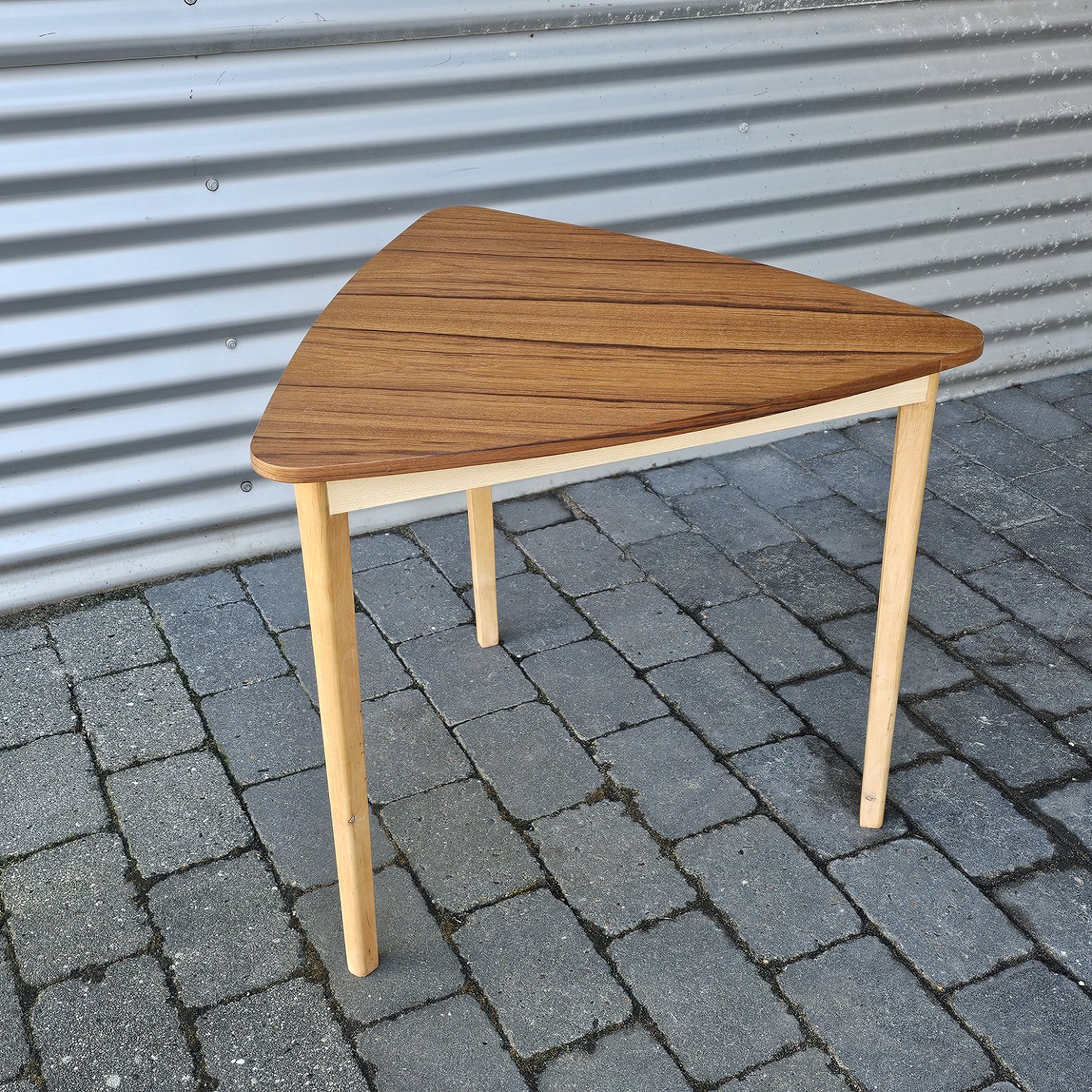 Trekantet sofabord med stel i bøg og bordplade i teaktræ
