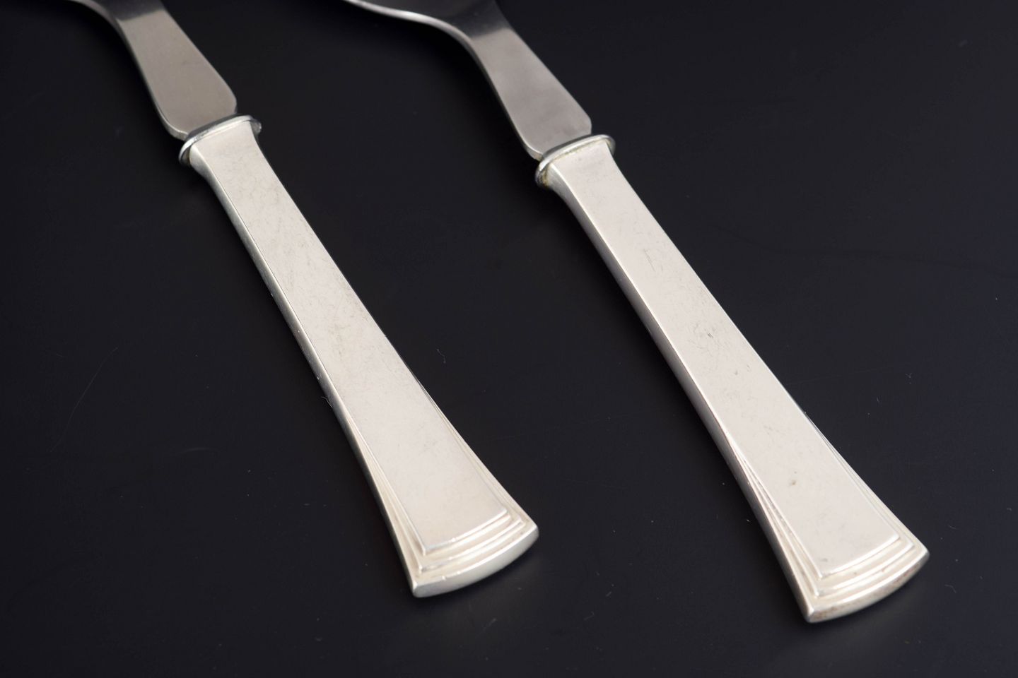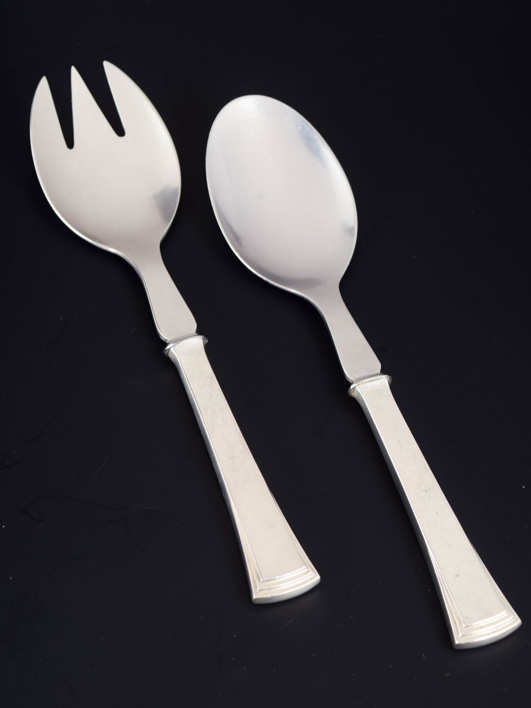 Elegant salatsæt i tretårnet sølv og rustfrit stål bestående af salatske og salatgaffel. Model nummer 32 med klassisk skaftform og diskret geometrisk afslutning. Fremstillet hos Evald Nielsen.