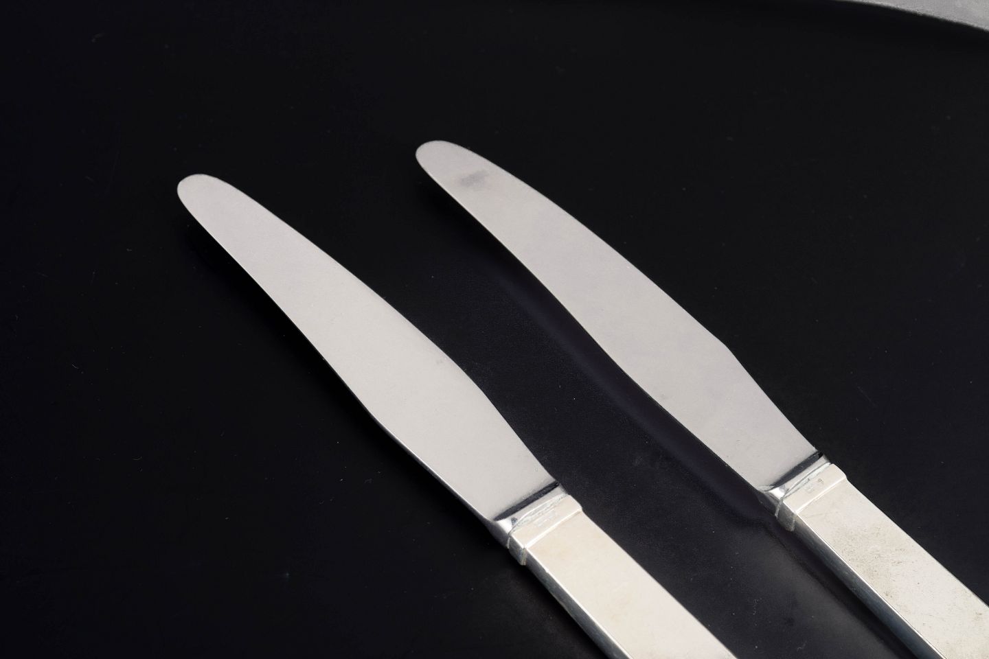 To frokostknive i rustfrit stål og sterlingsølv i modellen Relief fra Georg Jensen. Knivene har slanke blade i rustfrit stål og karakteristiske sølvskaft med parallelle rillede felter nederst på skaftet, et stramt og modernistisk design fra efterkrigstiden.