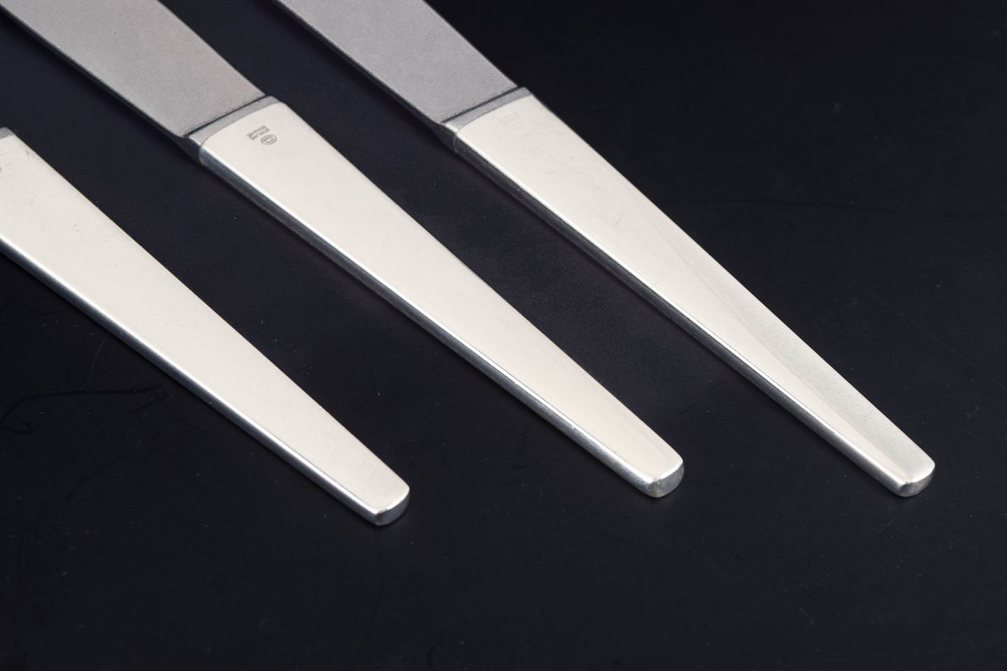 Tre middagsknive i rustfrit stål og sterlingsølv i modellen Caravel, designet af Henning Koppel for Georg Jensen. Bestikket er udført i et stramt og moderne formsprog med slanke linjer og en let konisk form, karakteristisk for Koppels funktionalistiske design.