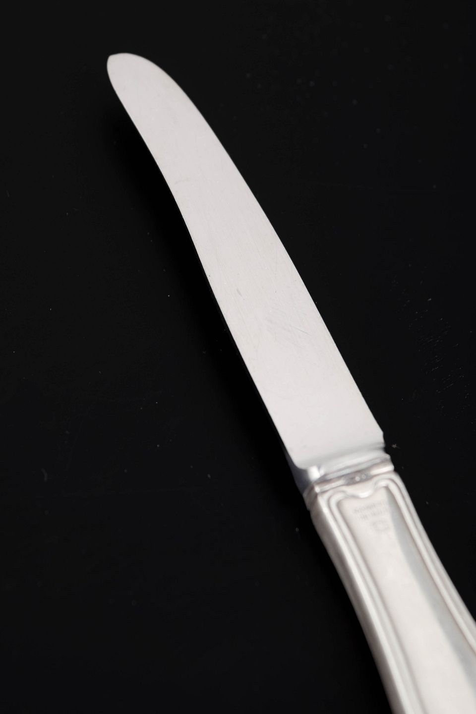 Rejsekniv i rustfrit stål og sterlingsølv med skaft i mønstret Dobbeltriflet. Kniven har et slankt blad i rustfrit stål og et elegant sølvskaft med de karakteristiske dobbelte rifler langs kanten, et klassisk design fra Georg Jensen.