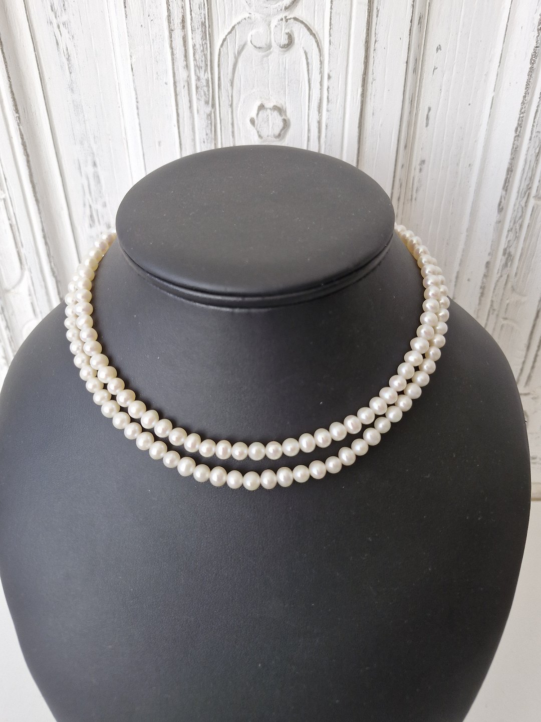 Længde 42 cm. Diameter på perlerne 5,7 mm.