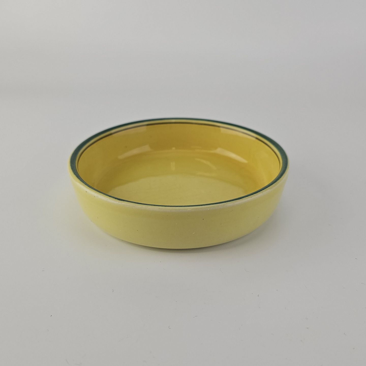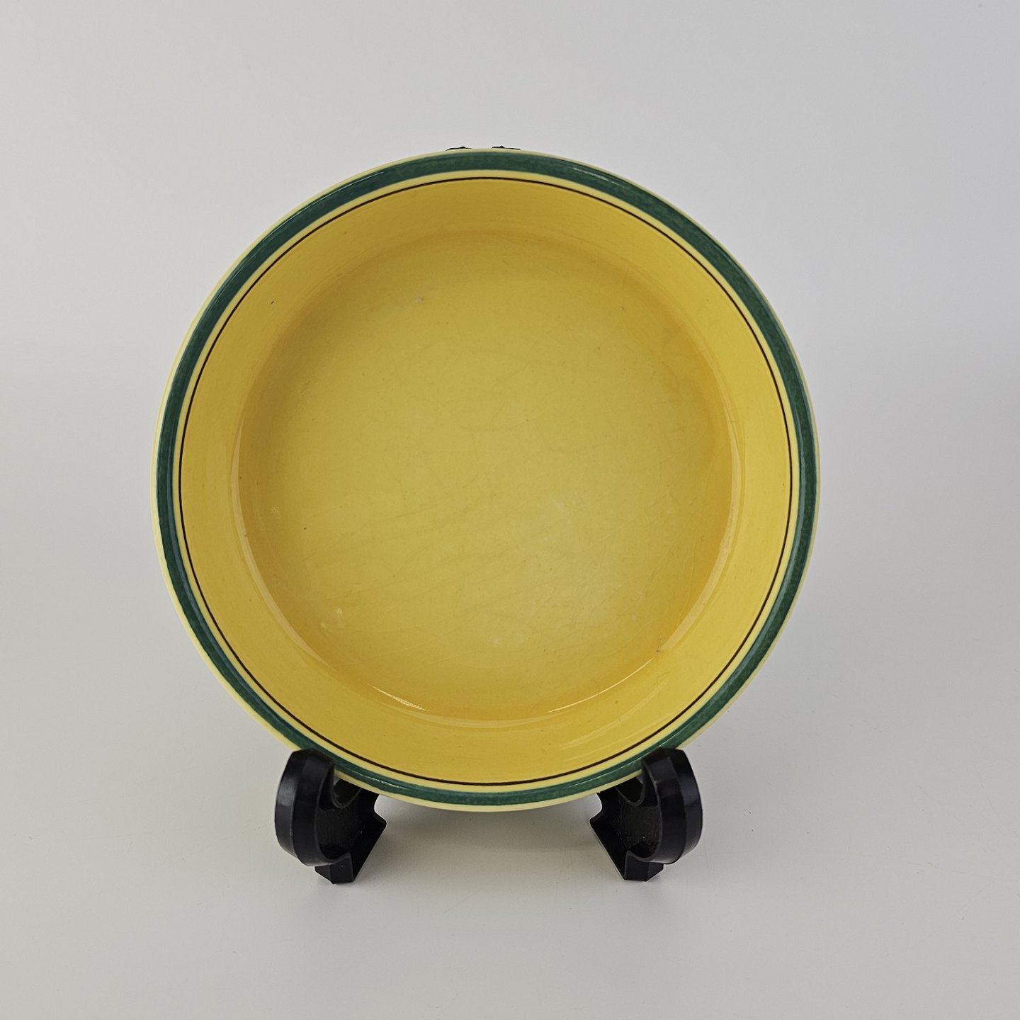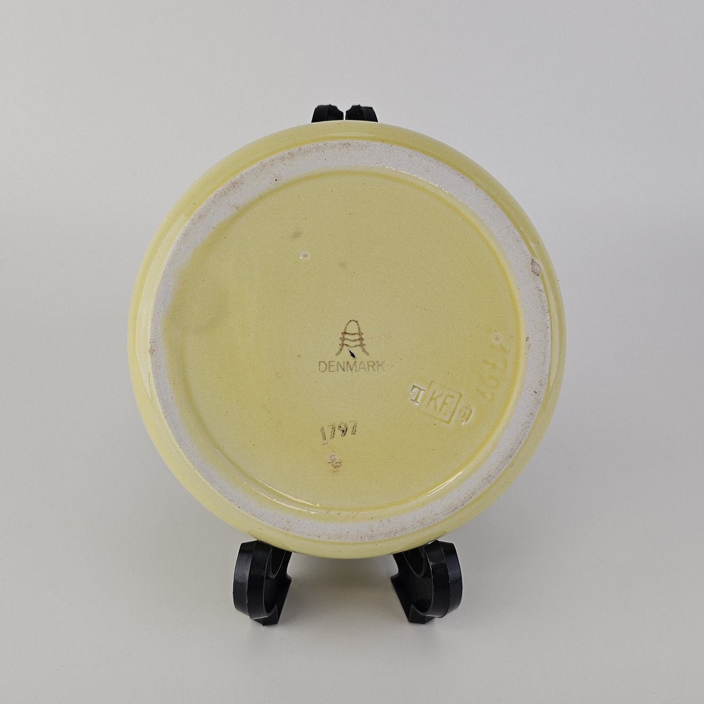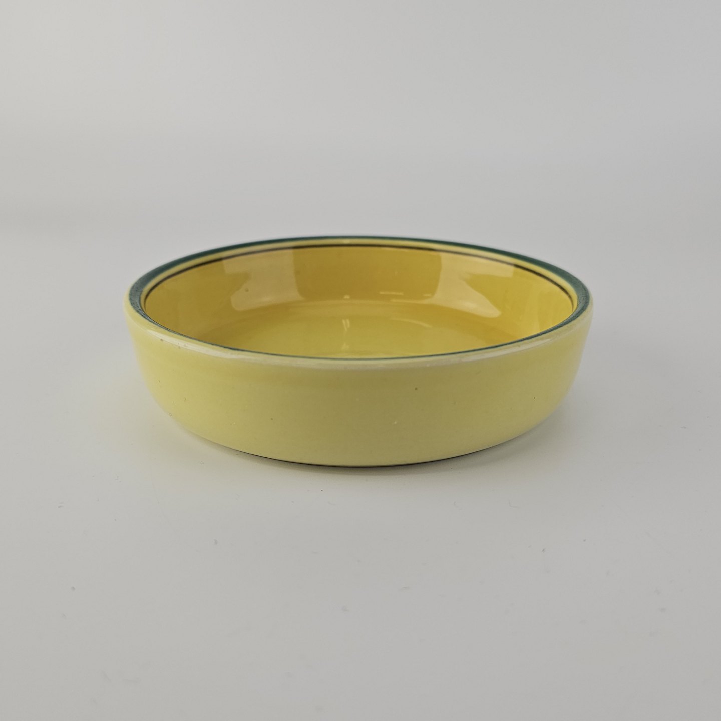 Fajancestel i stelform C med dekoration i gule nuancer med grøn stribe.