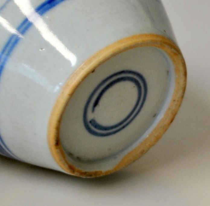 Kinesisk porcelæns bojan, 19. årh. Med blålige håndmalede landskabsdekorationer. Med trælåg. Højde med låg: 15 cm.