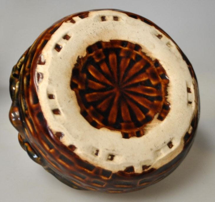 Fajance skål, ca. 1900. Brunglaseret. Dekoreret med en blæksprutte ved en kurv. H.: 7,5 cm. Dia.: 12,5 cm.
