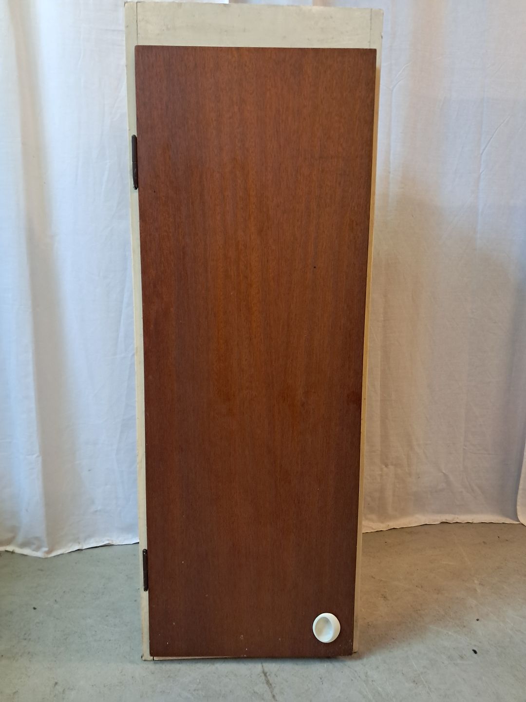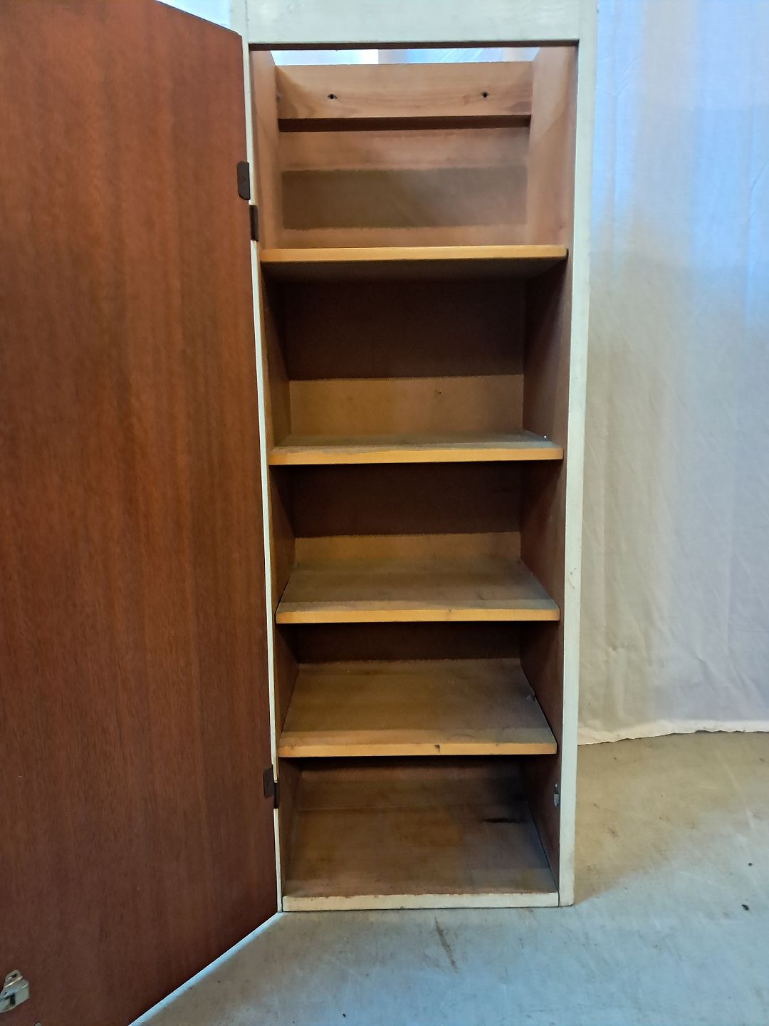 Gammelt malet køkkenskab med låge i fineret mahogni, fra 1950erne.