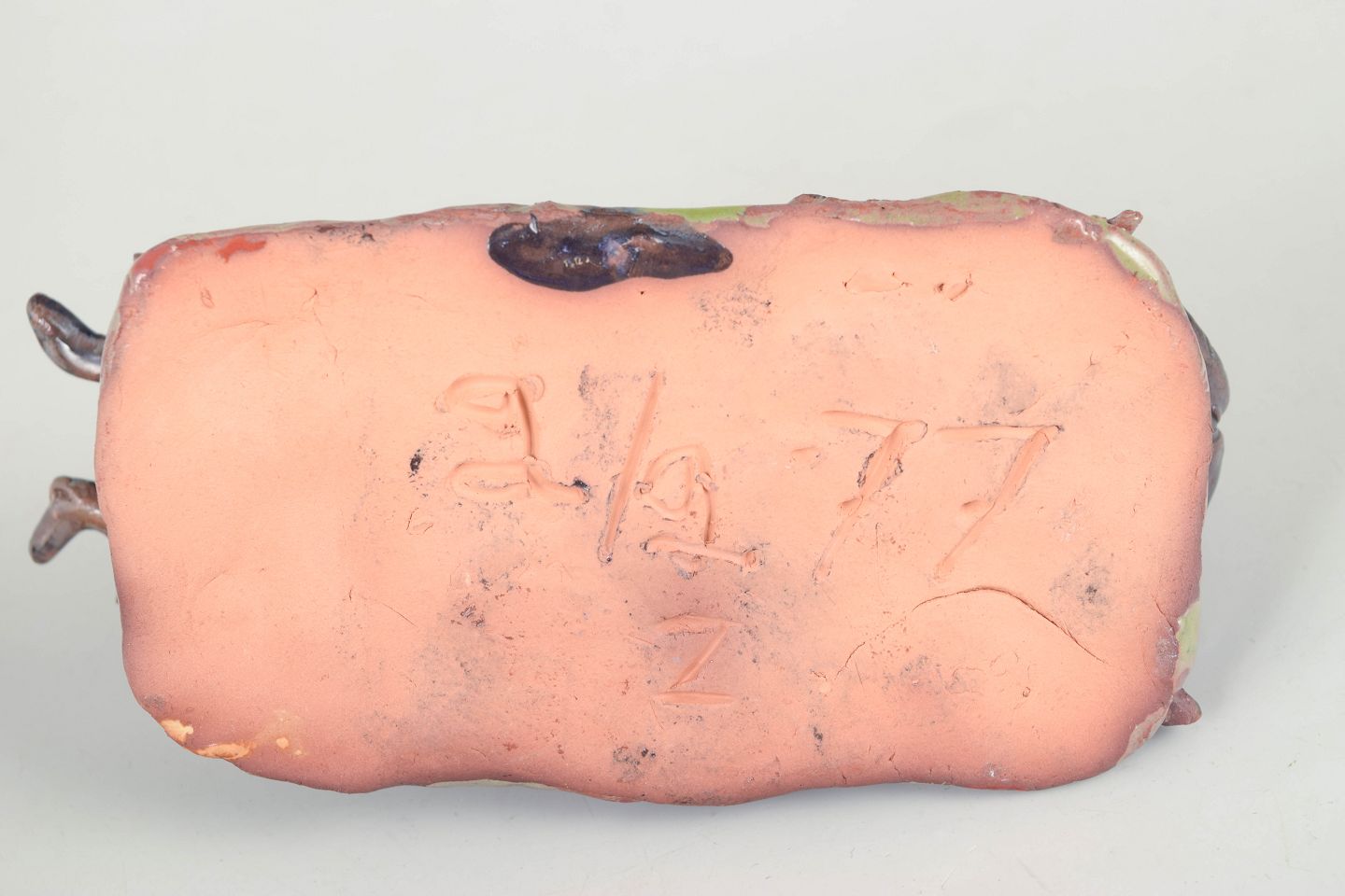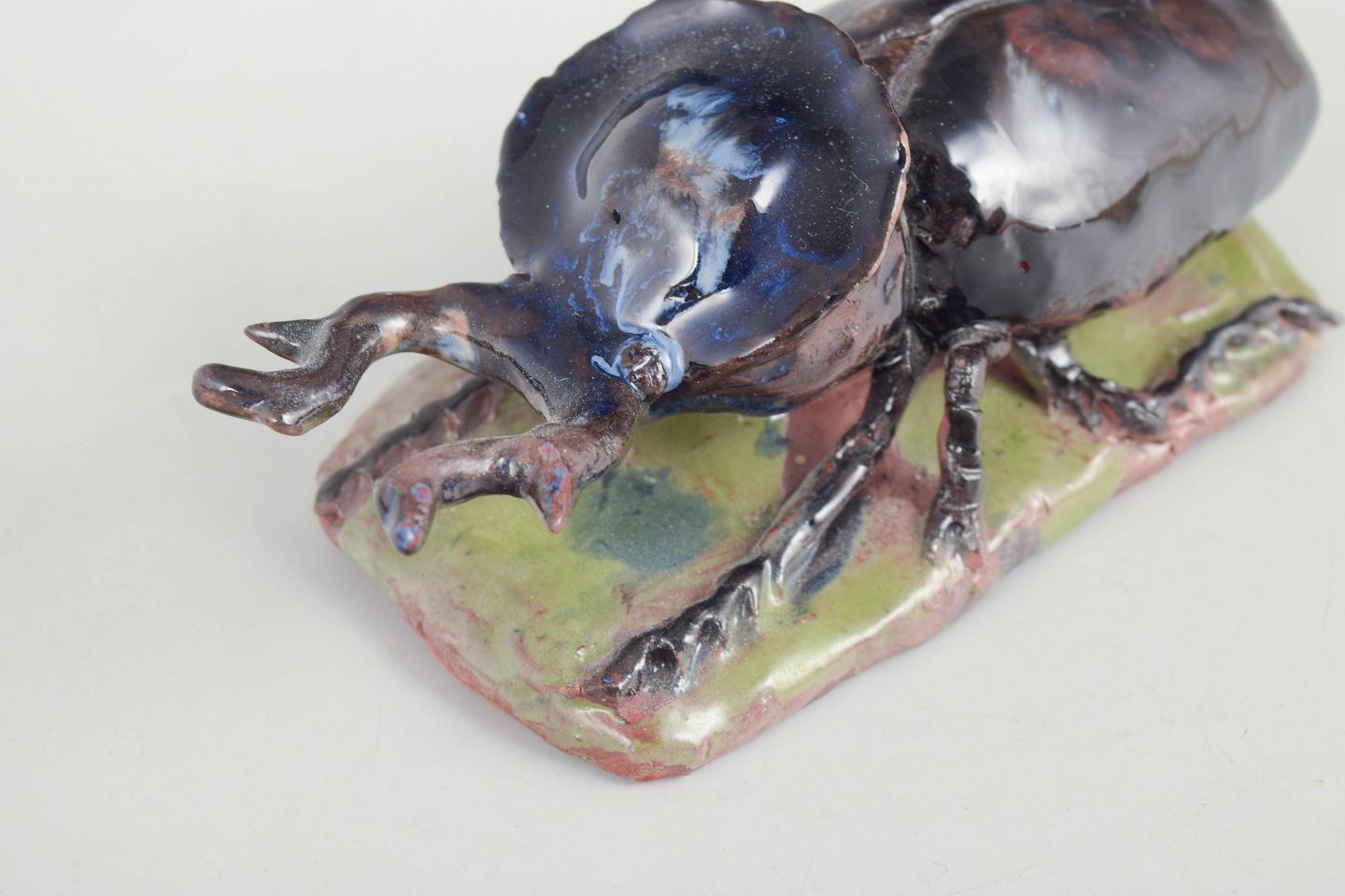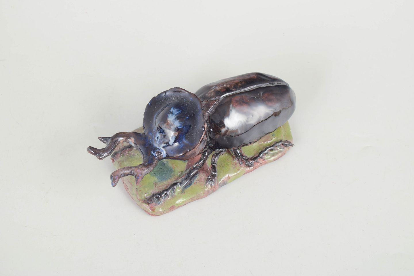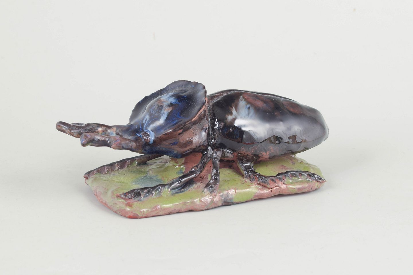 Unik keramisk figur forestillende et insekt udført i stentøj med blank, iriserende glasur i mørke blå, brunlige og grønne nuancer. Figuren er modelleret med naturalistiske detaljer og placeret på en lille base i ler, hvilket giver et levende og skulpturelt udtryk. Signeret og dateret 1977.