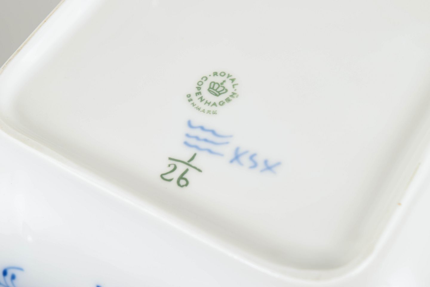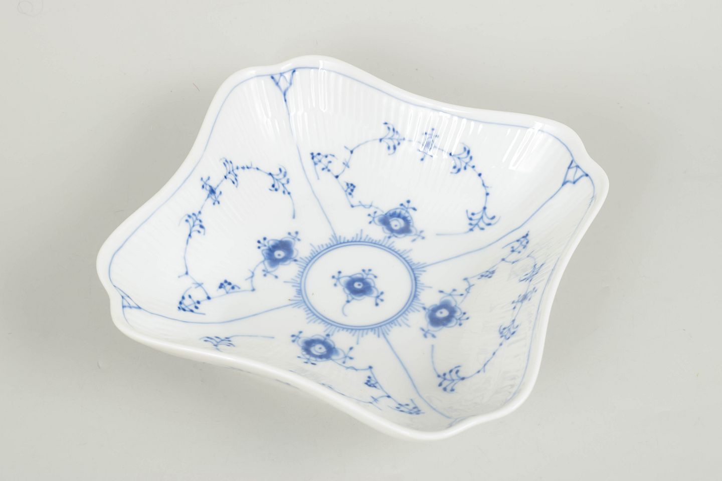 Håndmalet porcelænsskål dekoreret med det klassiske musselmalede riflet mønster i blå underglasur. Skålen har en elegant firkantet form med let svungne sider og riflede detaljer i godset. Centralt ses det karakteristiske blomsterornament omgivet af slyngede blomstergrene. Undersiden er fabriksstemplet Royal Copenhagen, første sortering. Model 1/26.