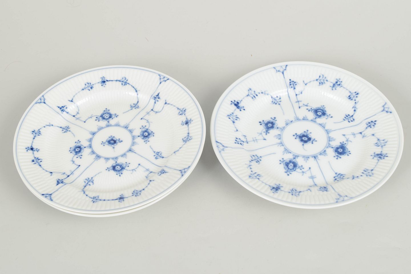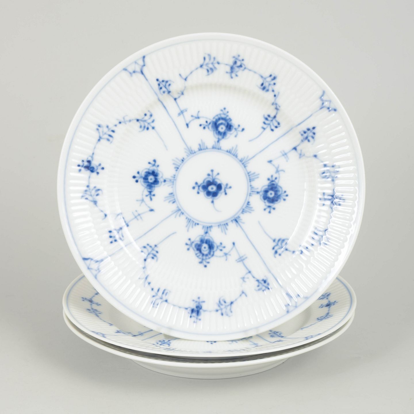 Sæt af tre håndmalede porcelænstallerkener dekoreret med det klassiske musselmalede riflet mønster i blå underglasur. Tallerkenerne har riflet fane og centralt blomsterornament omgivet af slyngede blomstergrene, et karakteristisk træk ved serien. Undersiden er fabriksstemplet Royal Copenhagen, første sortering. Model 1/179.