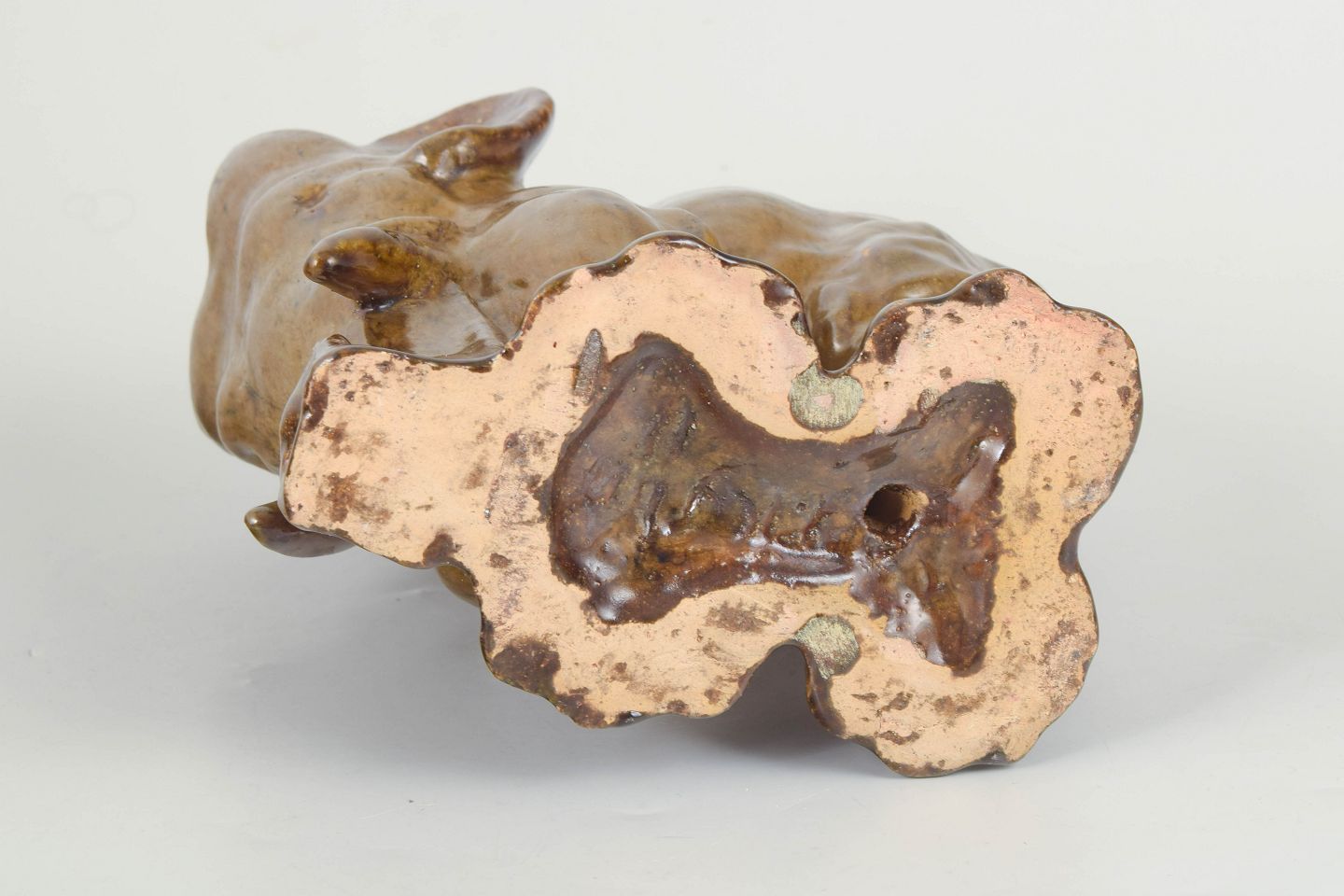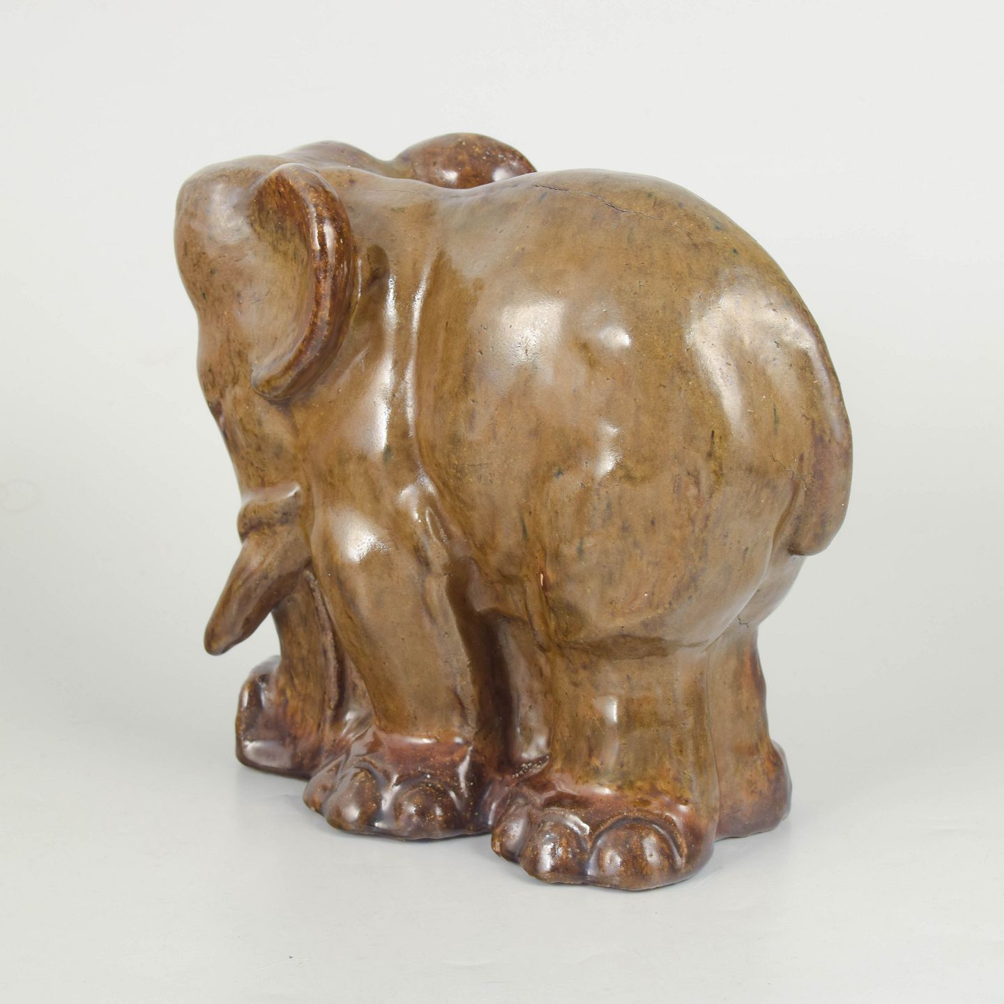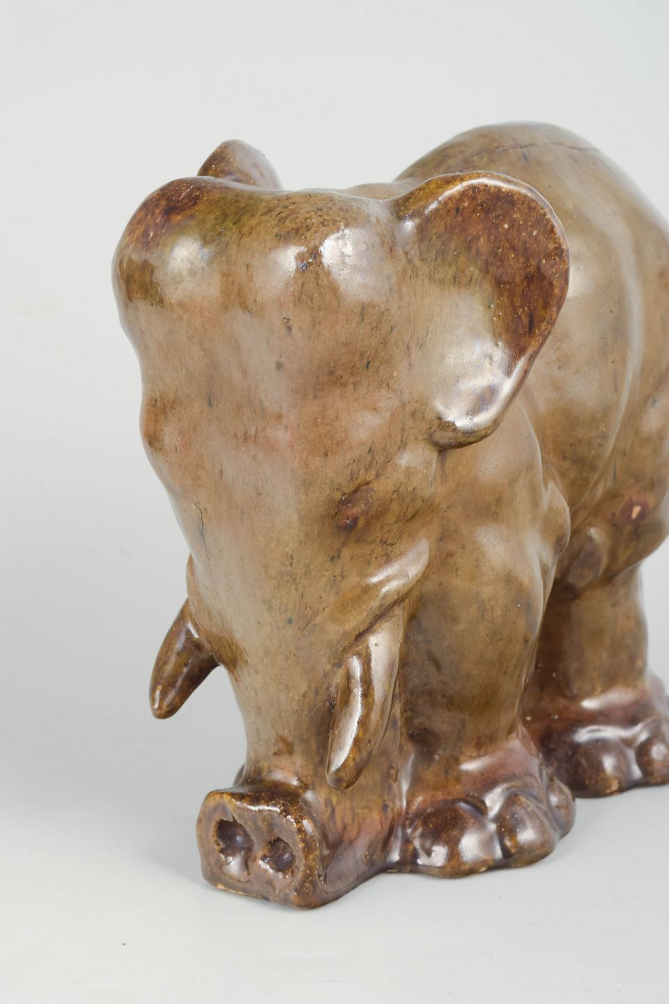 Naturalistisk elefantskulptur udført i glaseret stentøj med varme brunlige nuancer og levende glasurspil. Figuren er modelleret med en blød, organisk form og karakterfuld overflade, typisk for Poul Kyhns dyreskulpturer. Signeret og fremstår som et unikt værk fra kunstnerens tidlige produktion.