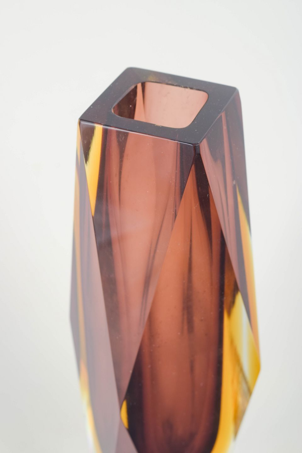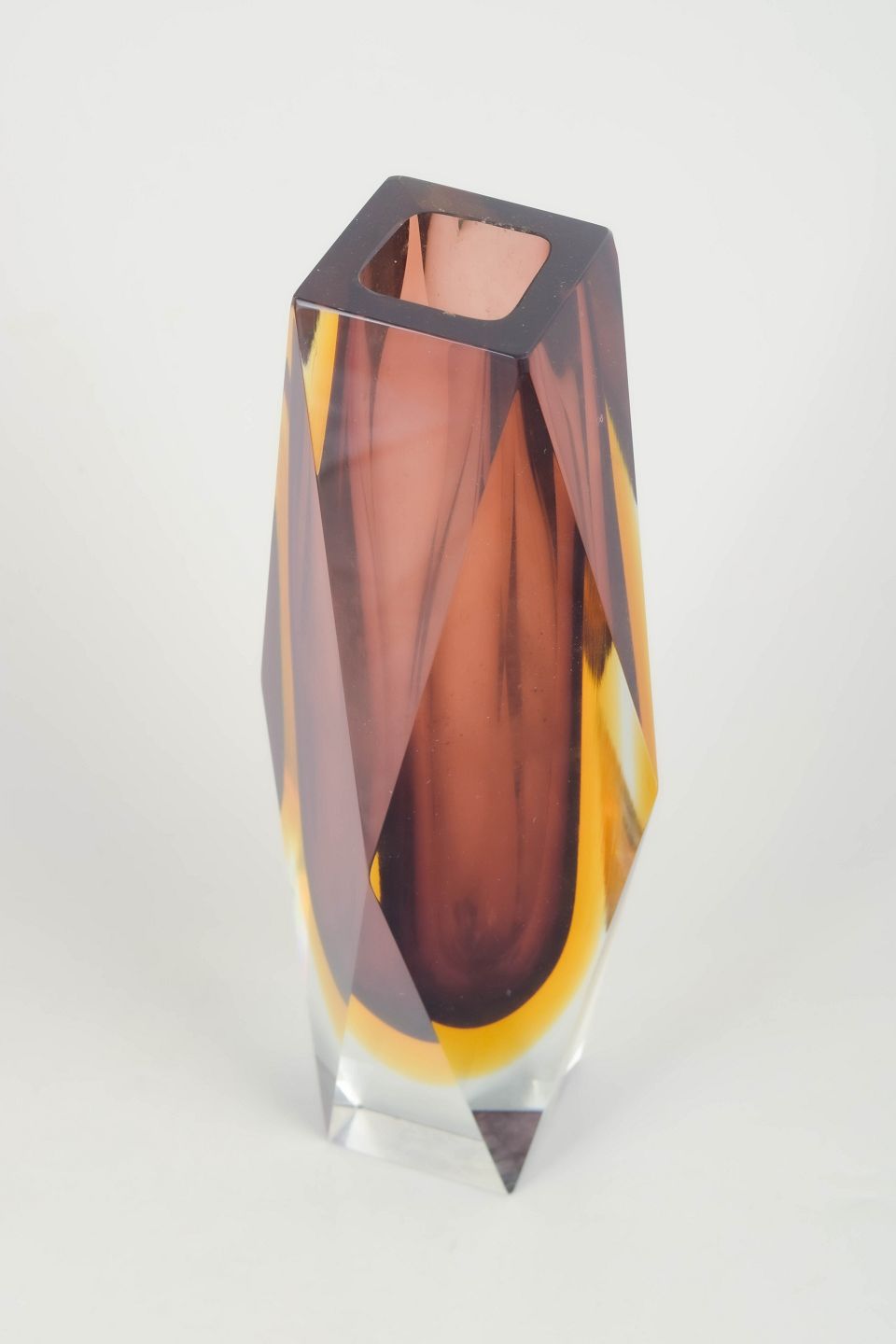 Facetteret kunstglasvase i klart glas med indkapslet ravfarvet kerne og geometrisk slebne sider, udført i karakteristisk Murano-stil med kraftig skulpturel form.