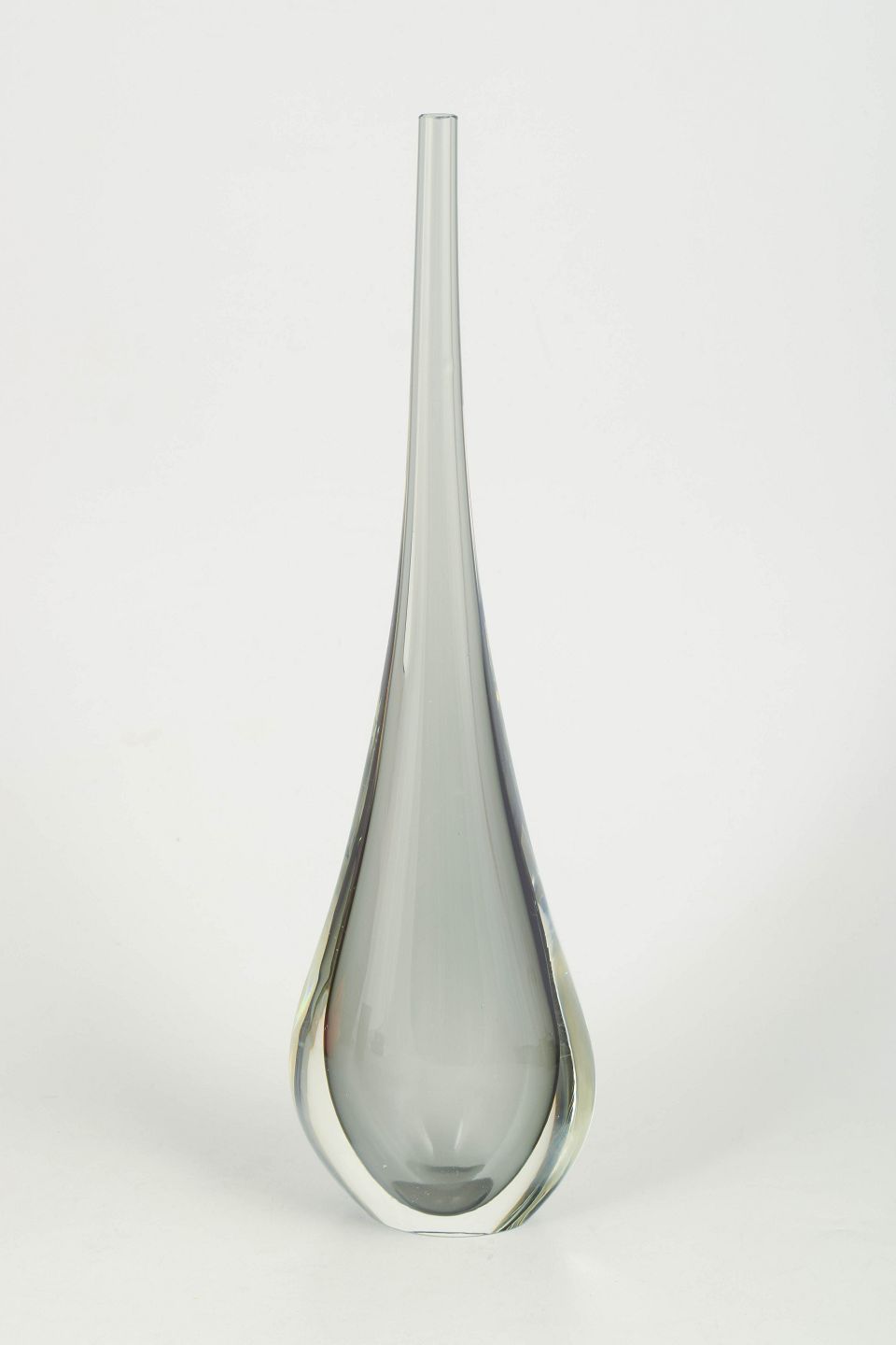 Slank kunstglasvase i klart glas med elegant dråbeformet silhuet og lang smal hals, udført i karakteristisk Murano-stil med tung bund og raffineret form.