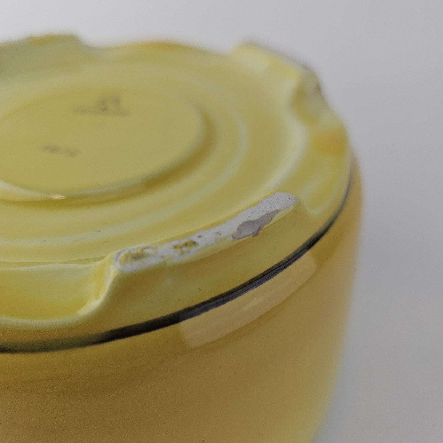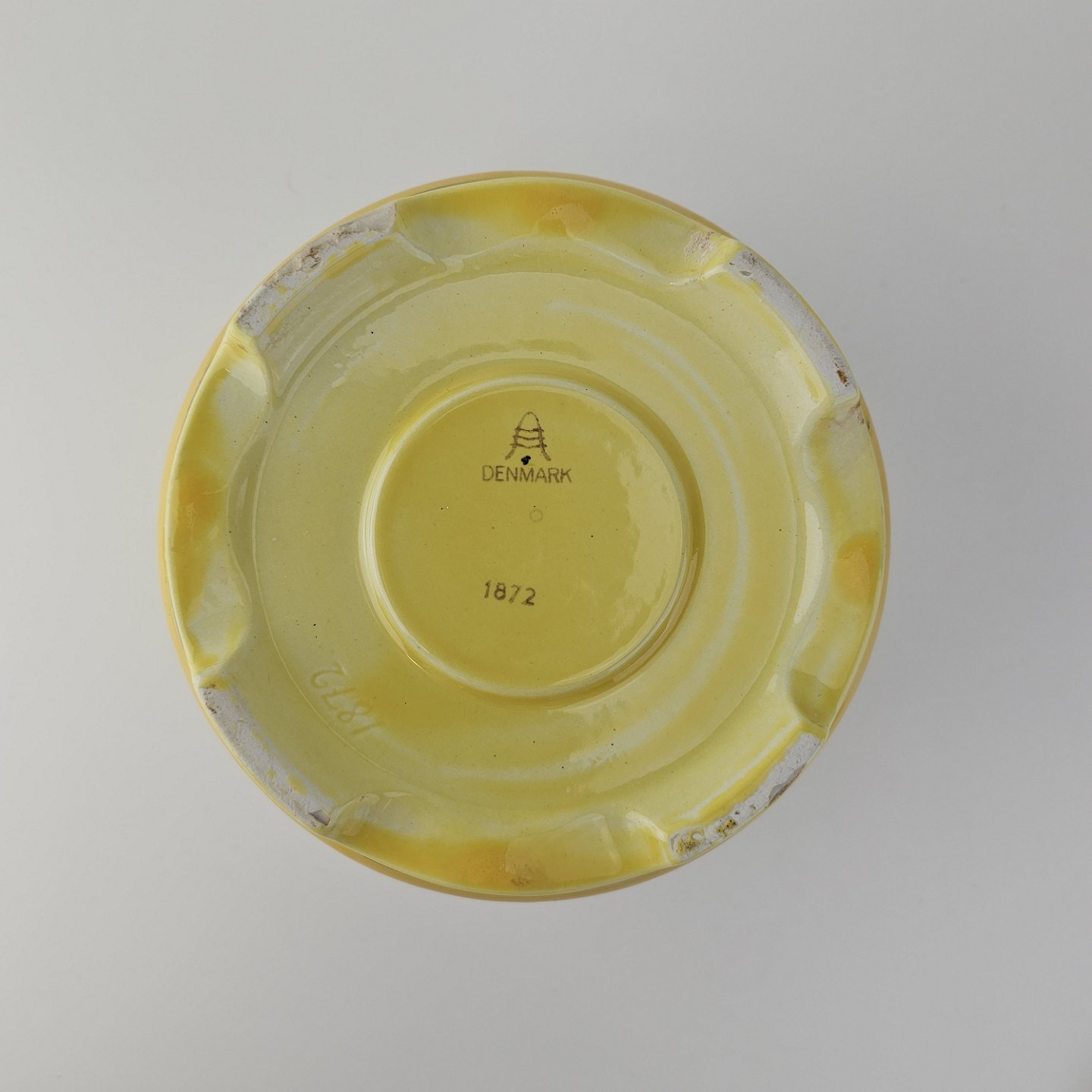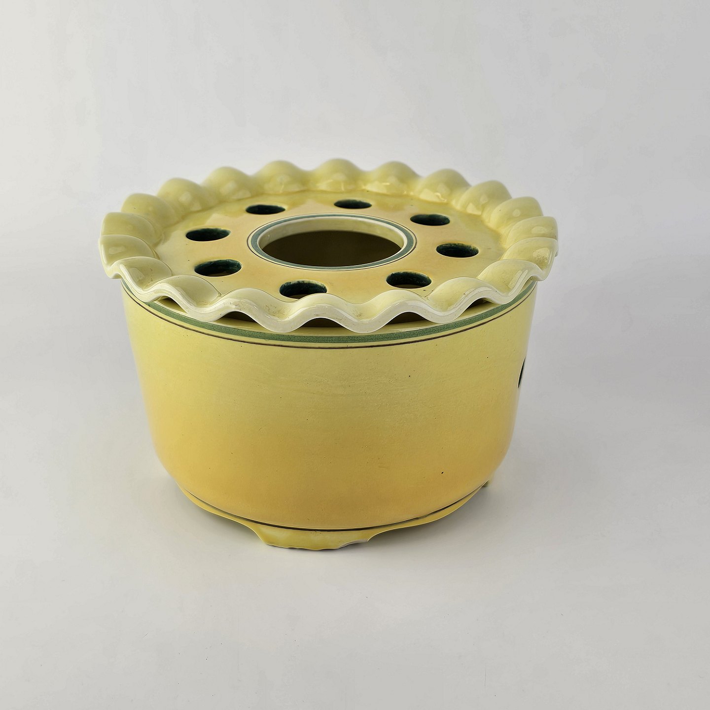 Fajancestel i stelform C med dekoration i gule nuancer med grøn stribe.