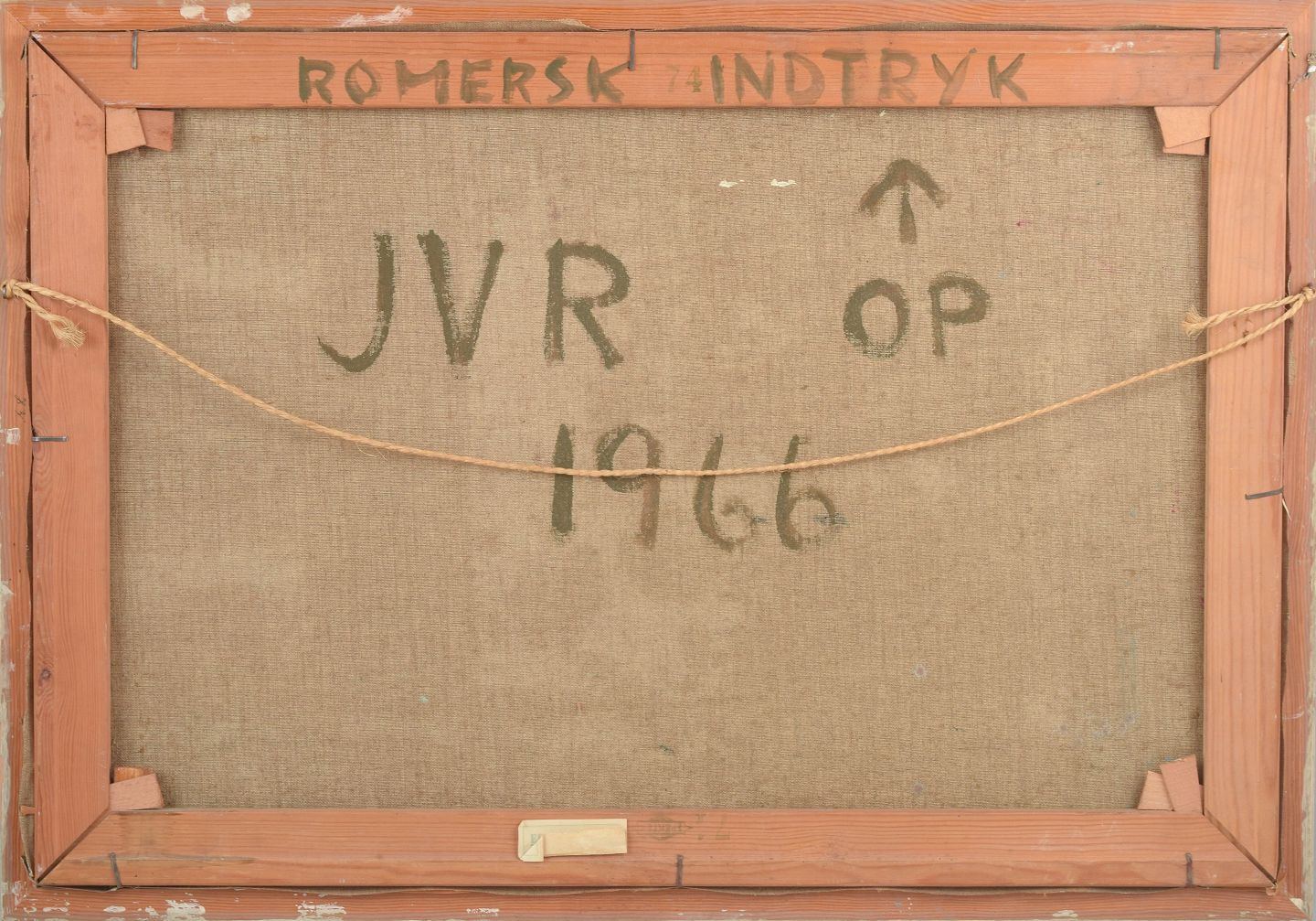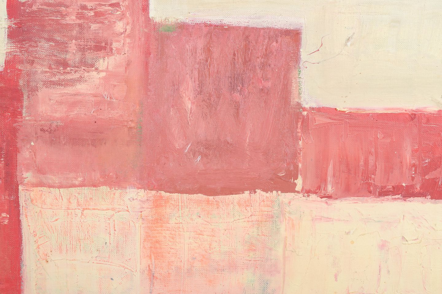 Abstrakt komposition udført i olie på lærred med geometriske og arkitektoniske former i varme røde og rosa toner, signeret JVR og dateret 1966.