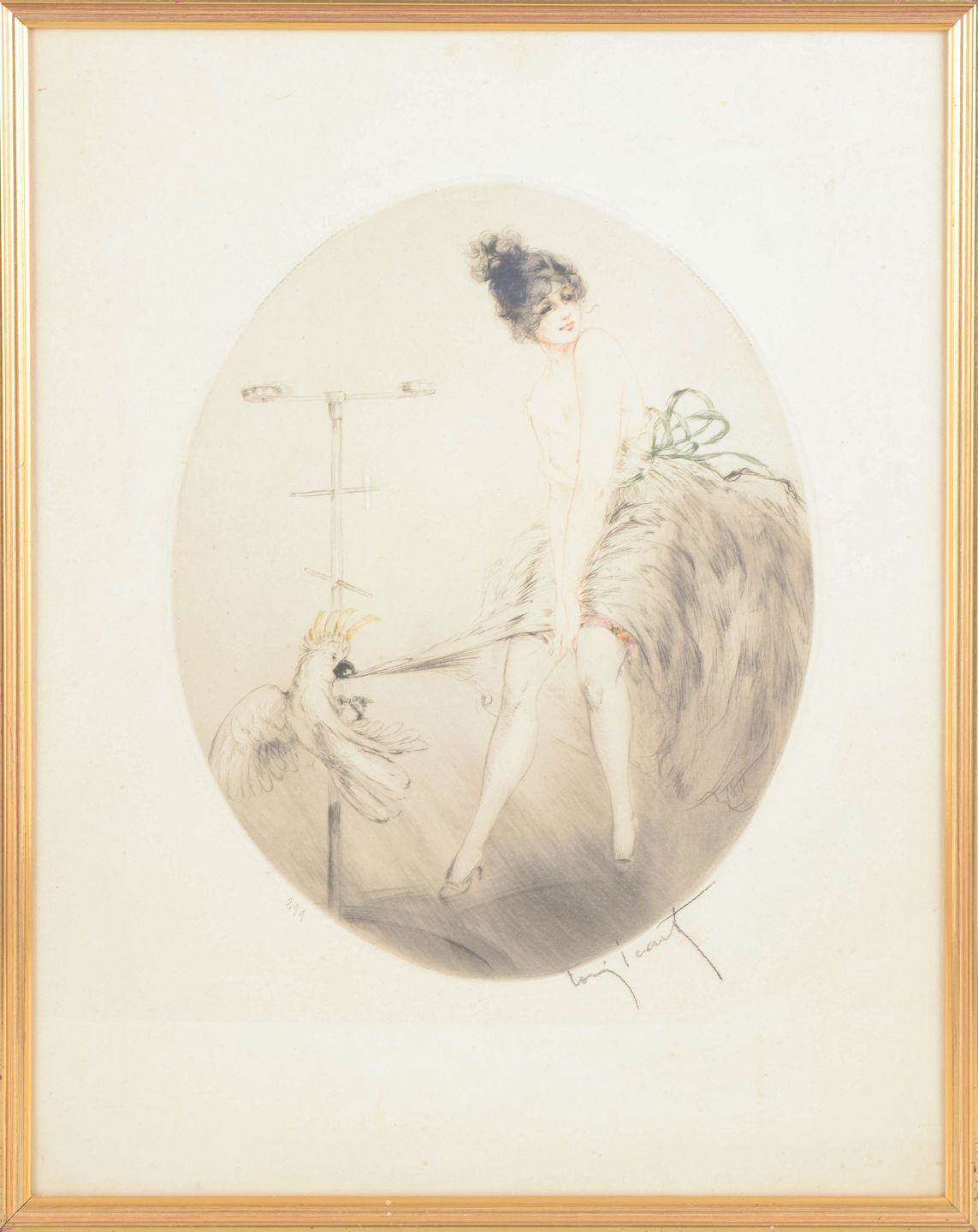 Louis Icart, farve-etsning “Jeune femme et perroquet”, fransk kunstner.
