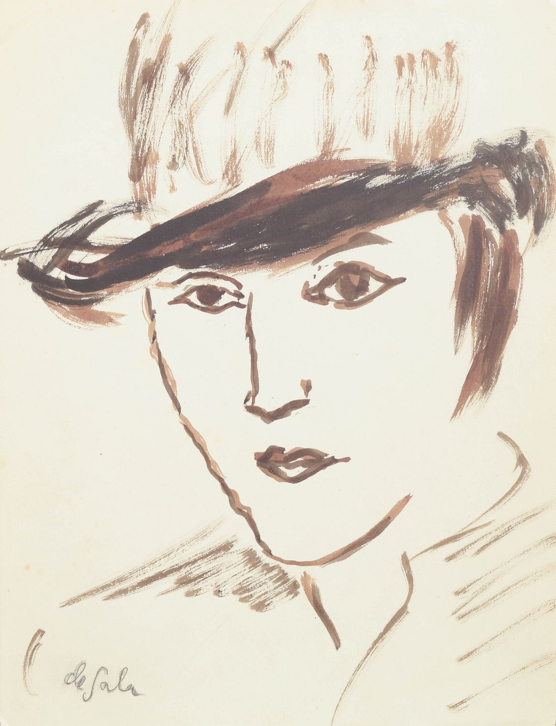 Art deco portrættegning udført på papir med frie, sikre pensel- og stregbevægelser. Motivet viser et stiliseret kvindeportræt med hat, gengivet i en enkel og elegant lineær stil typisk for 1930’ernes grafiske udtryk.