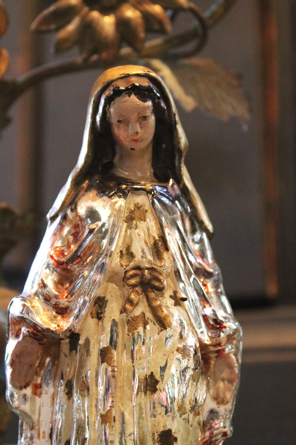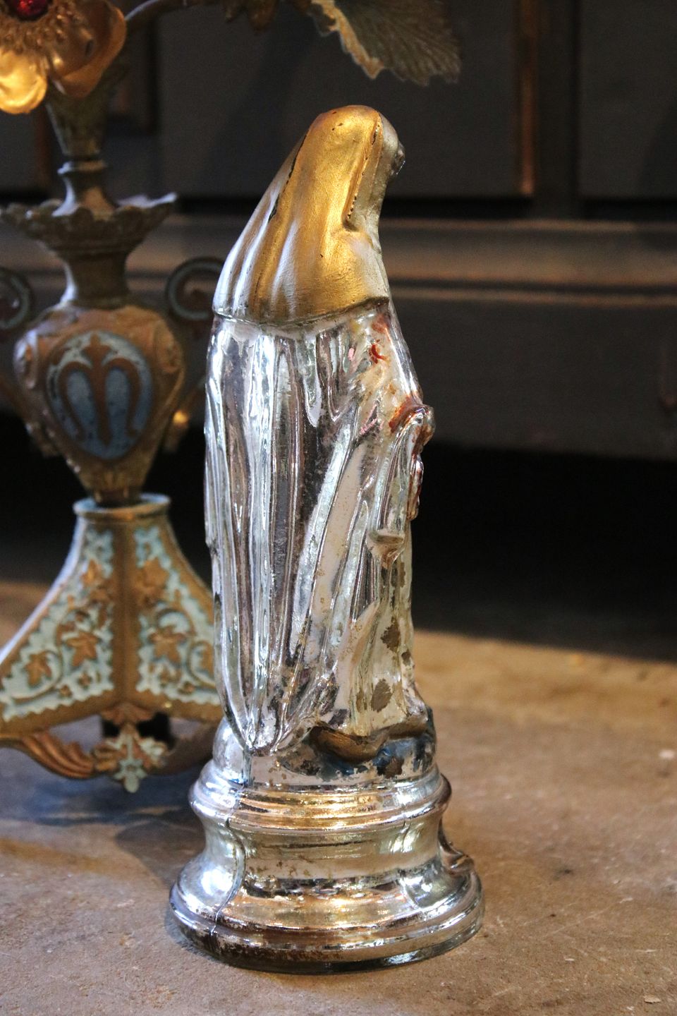 Antik 1800 tals Madonna figur i fattigmandssølv / Mercury glass med fin gammel bemaling...