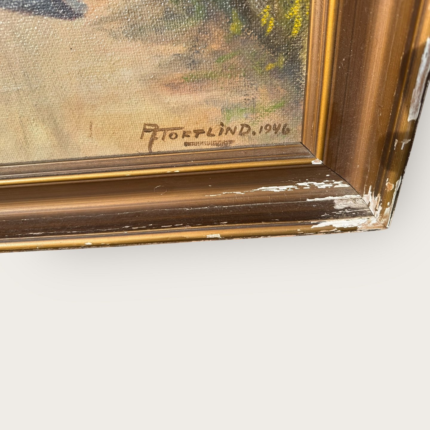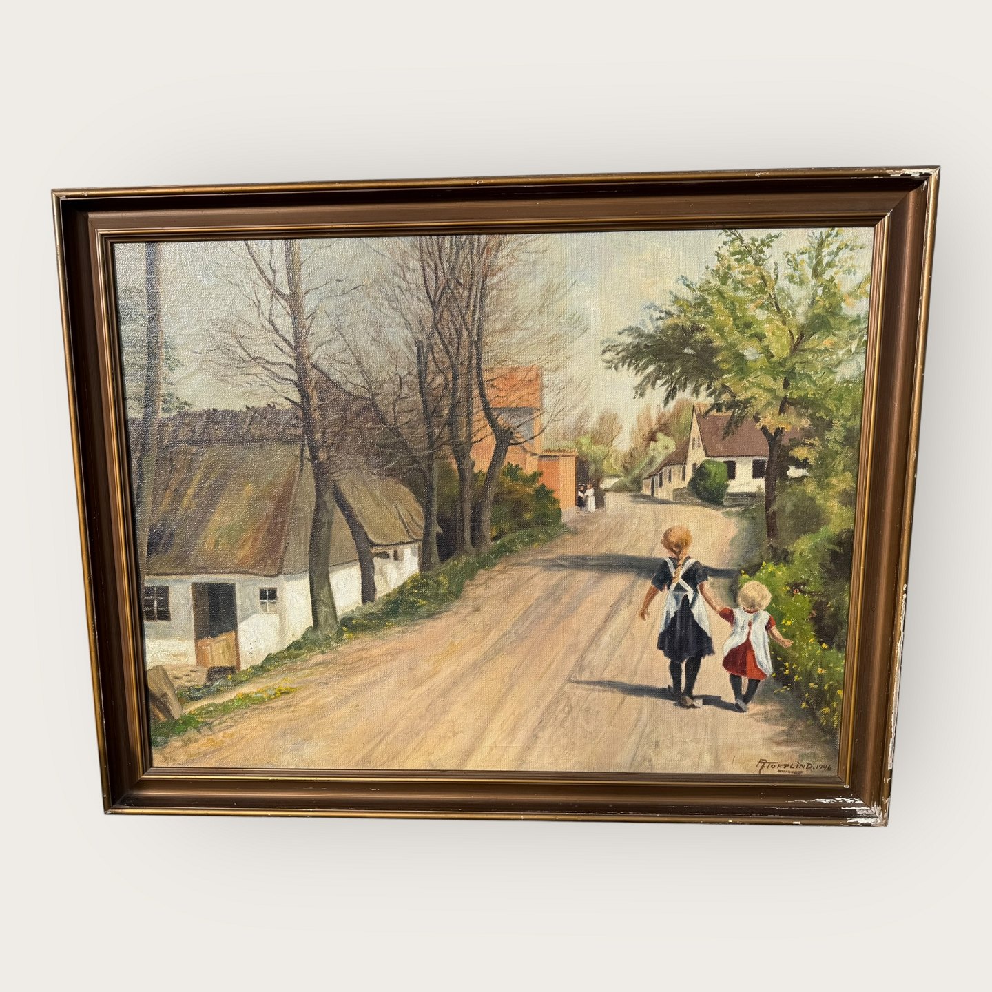 A. Toftlind, Piger på en vej, oliemaleri på lærred, lidt afskalninger på billedrammen ellers pæn stand, Mål med ramme: 110x85cm