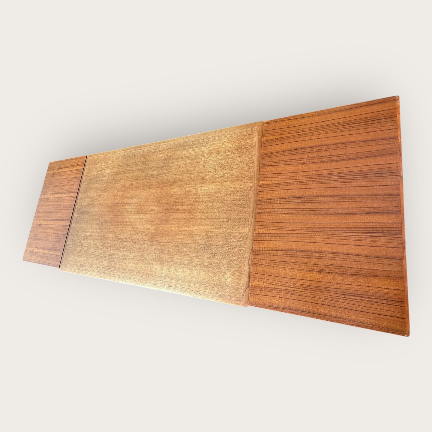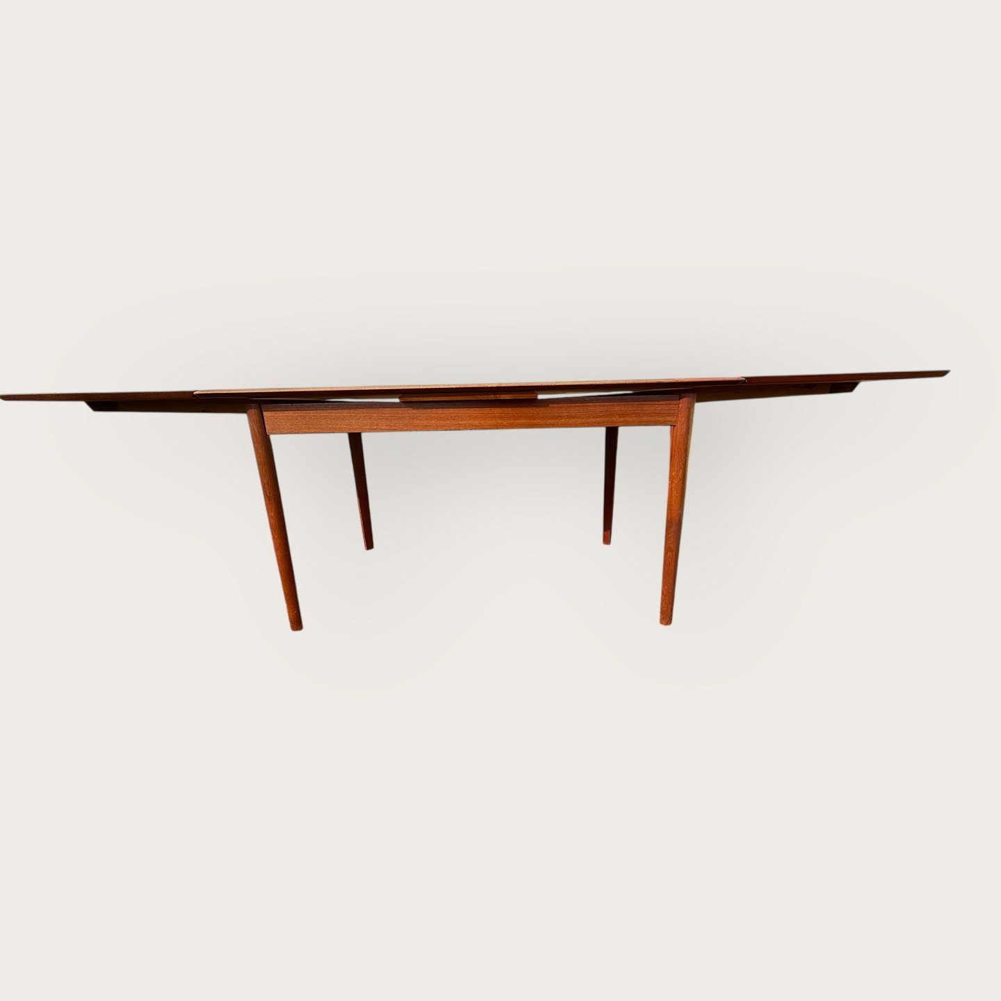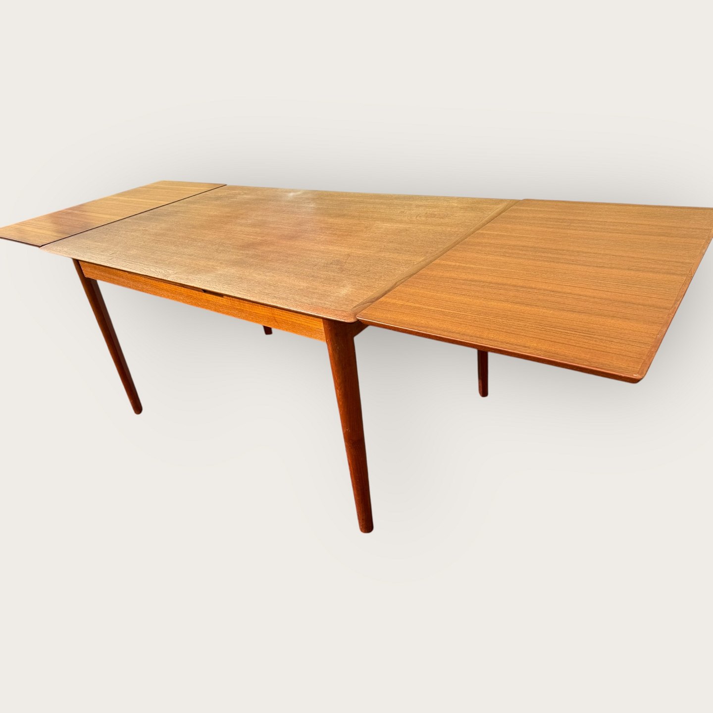 Spisebord i teakfiner med ben i massiv teaktræ, Danish modern fra 1960'erne, mærket med Ellegaards møbelfabrik og EG møbler Silkeborg No 80 (se to fotos), Mål: HxBxL 73x89x139 (240)cm * Pæn brugt stand*