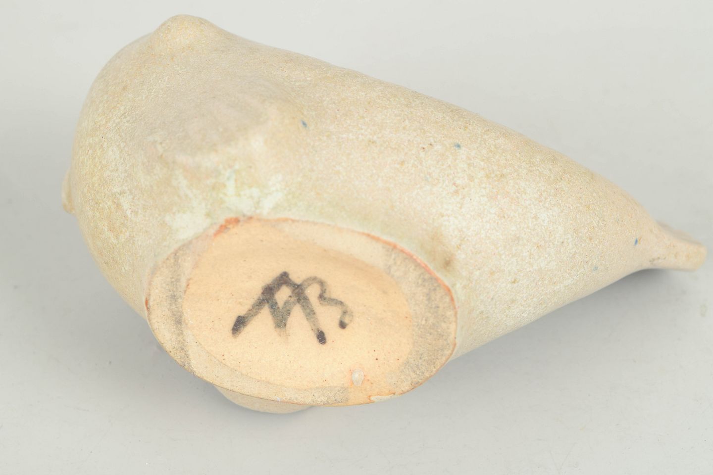 Organisk formet fisk i hånddrejet stentøj med blød, afrundet form og lys, mat glasur med diskret spil i overfladen. Et karakteristisk eksempel på Arne Bangs naturalistiske og skulpturelle formsprog fra 1940’erne.