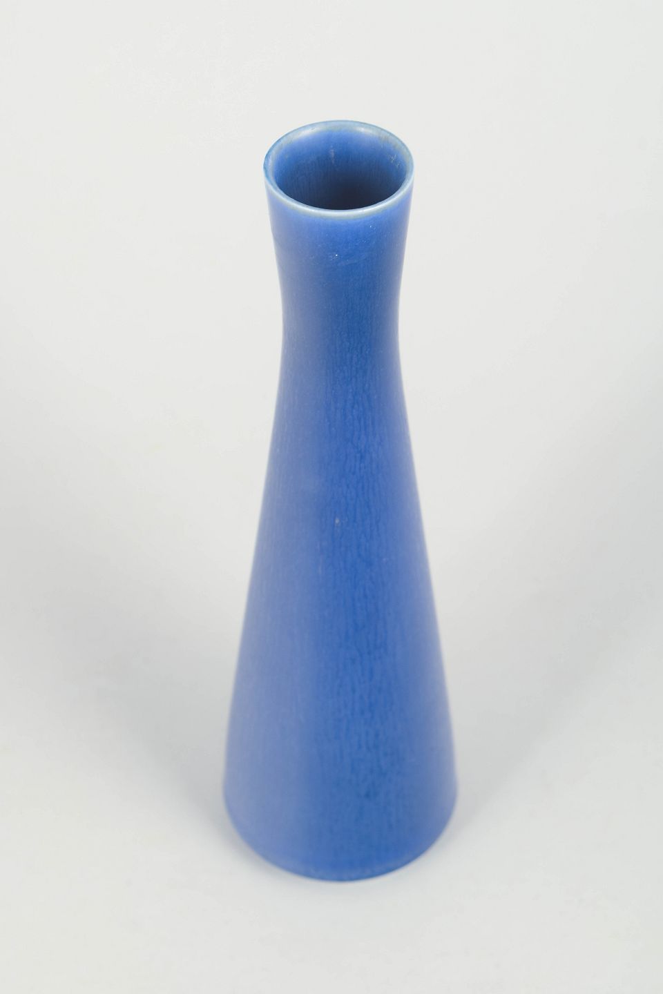 Slank og elegant formet vase i drejet stentøj med karakteristisk blå harepelsglasur, signeret FB under bunden.
