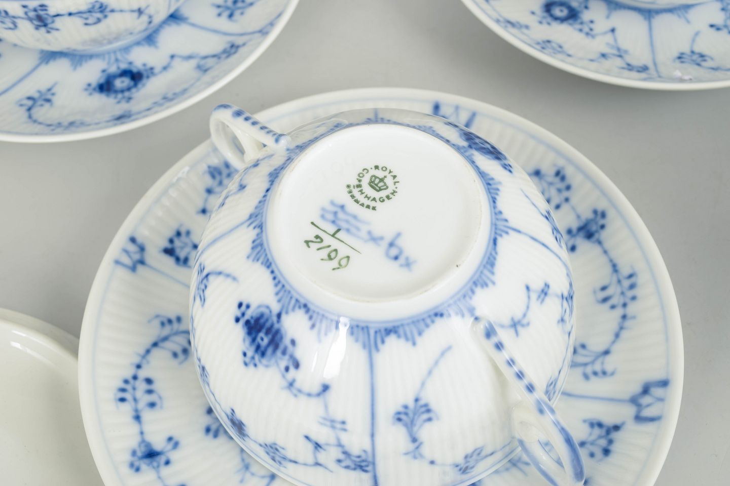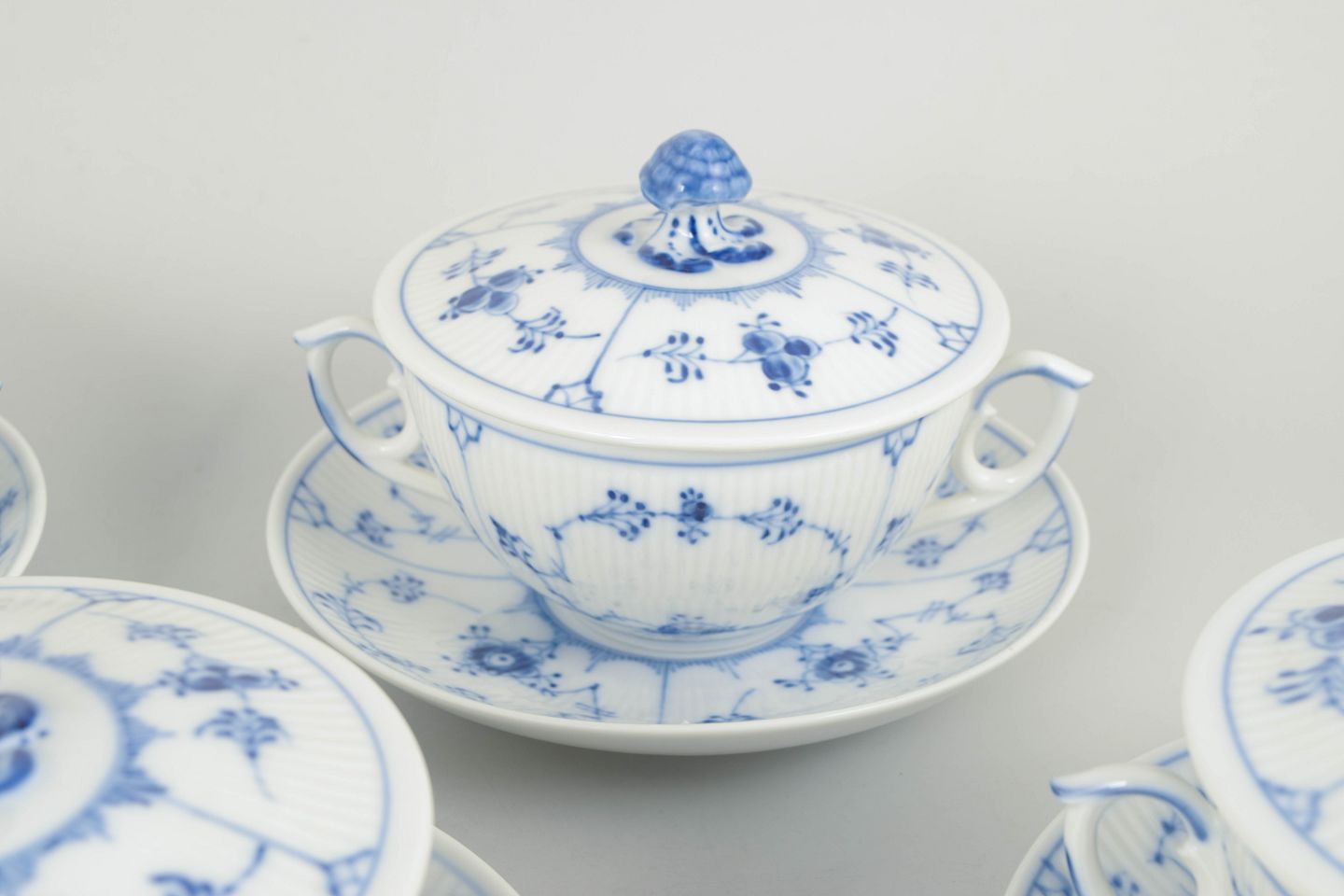 Sæt af fire bouillonkopper i porcelæn med matchende underkopper, dekoreret i underglasur blå med klassisk musselmalet riflet mønster. Model 1/2199, 1. sortering, dateret 1966.