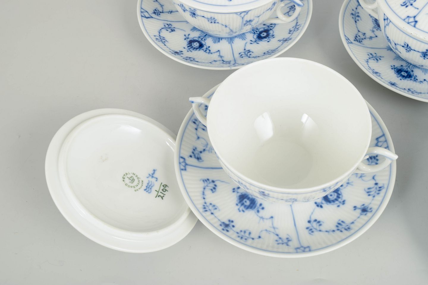 Royal Copenhagen, musselmalet riflet sæt af fire bouillonkopper med underkopper.