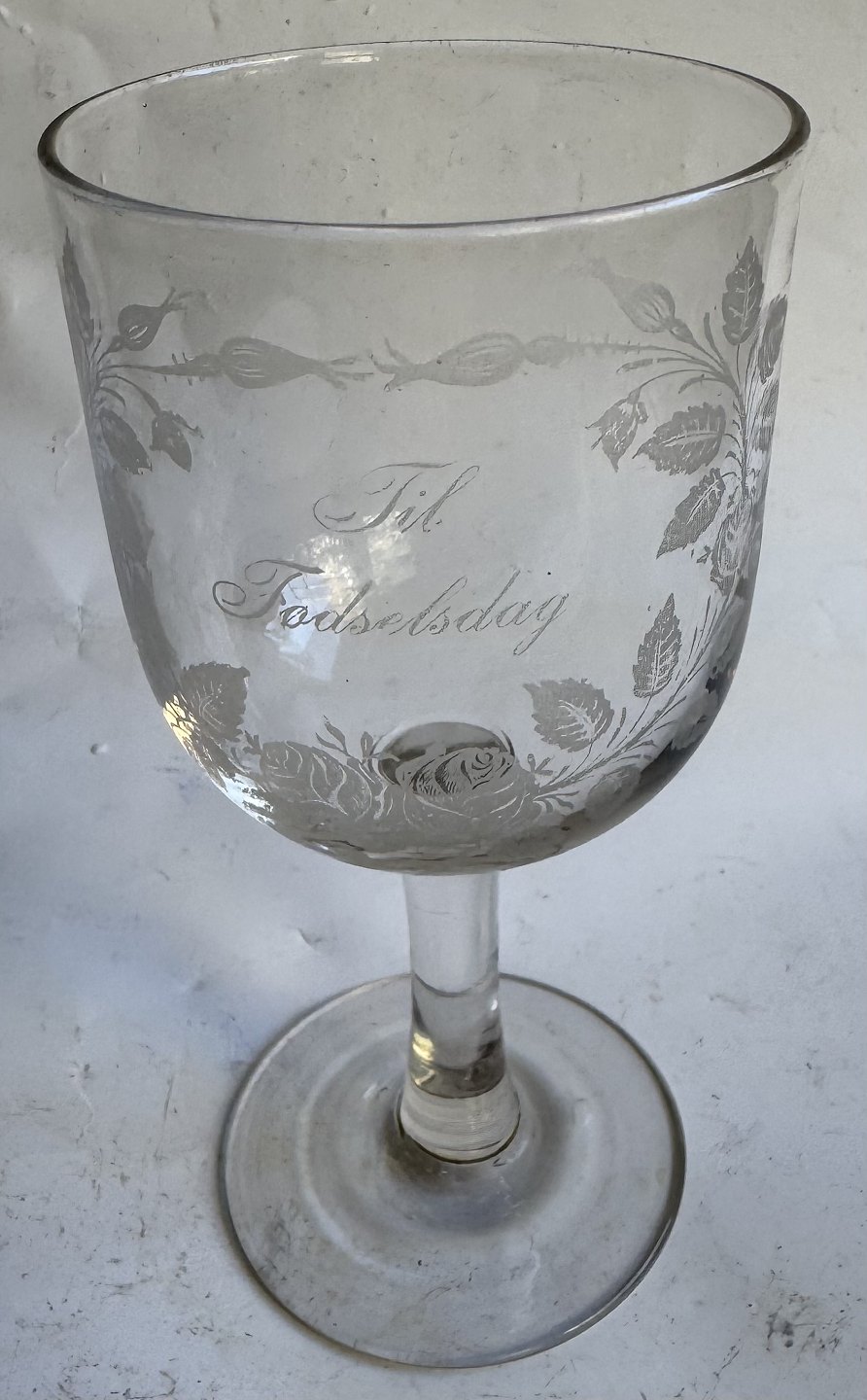 Gammelt dansk vin glas fra Kastrup Glasværk i form af erindringsglas fra ca. 1910. Fremstår i god stand uden skader eller reparationer med teksten: "Til Fødselsdag". H. 16 cm