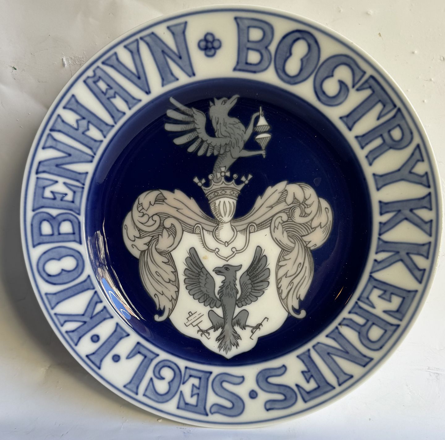Bing & Grøndahl porcelæns platte; Bogtrykkernes segl i København. Designet af Fanny Garde. Har lidt "støv" på bagsiden øverst (se billeder). Ellers i fin stand. 1. sortering. Ingen skader eller reparationer. Ø. 24 cm.