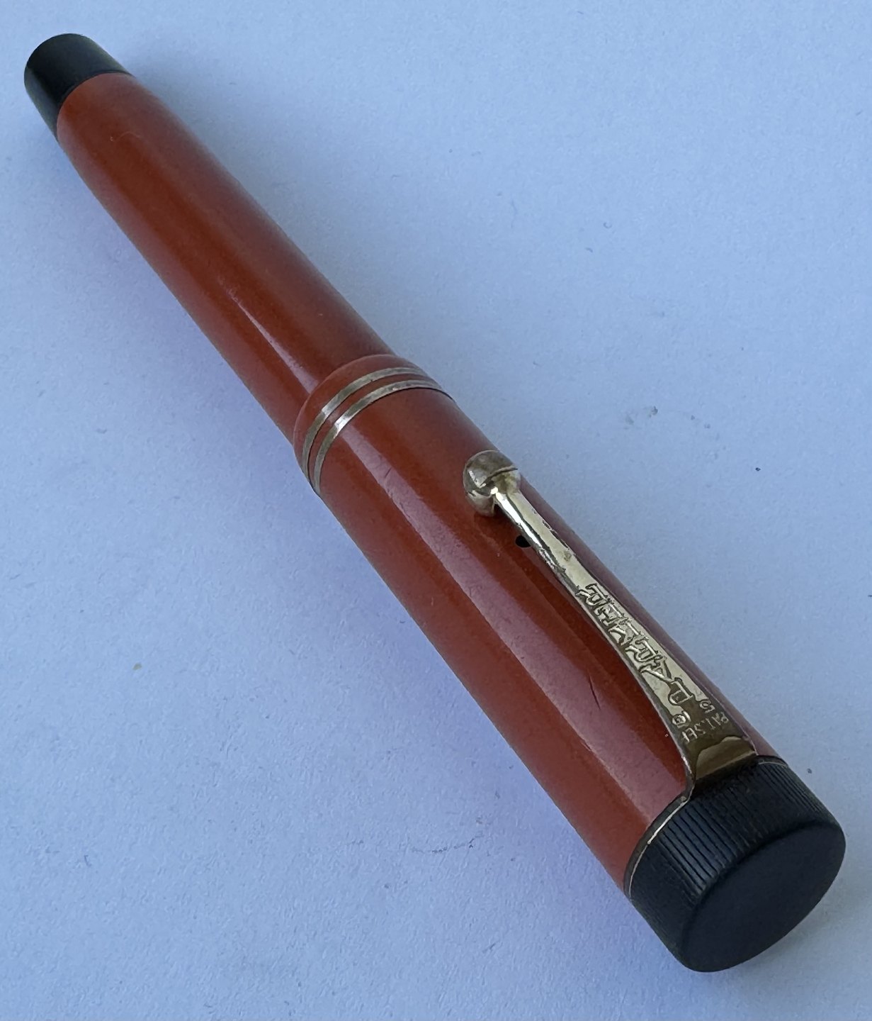 Stor koralrød Parker Duofold Lucky Curve fyldepen fra 1930'erne. Indgraveret personligt navn. Fremstillet i U.S.A. Fremstår I god stand uden skader eller reparationer. Push button blæk-påfylder. Der skal indsættes ny gummisæk før end den fungerer igen. Ny gummisæk kan indsættes for et tillæg på kr. 250,-