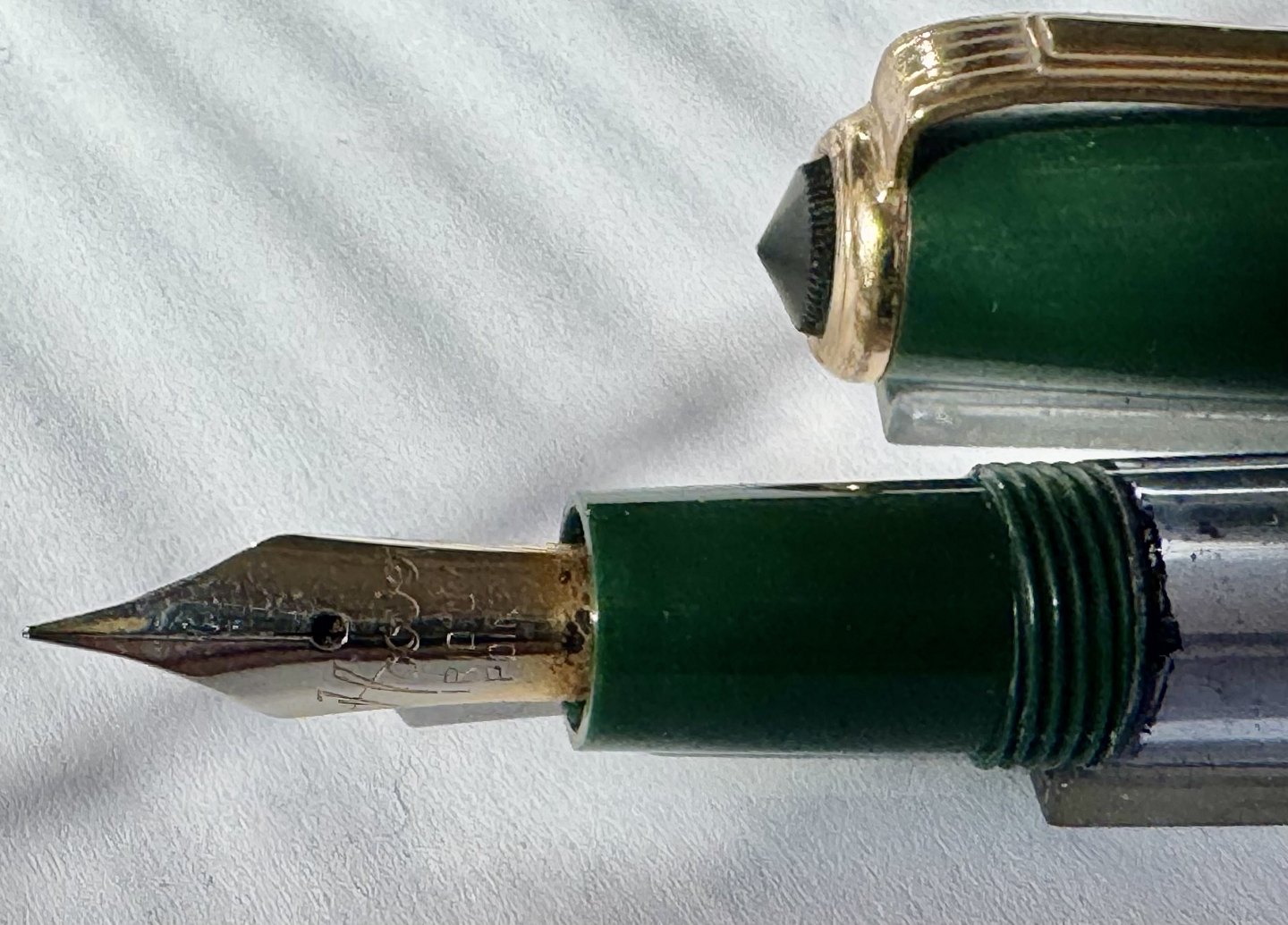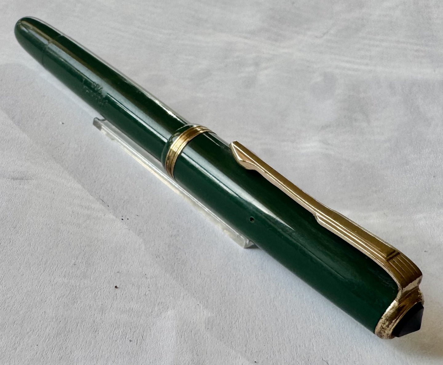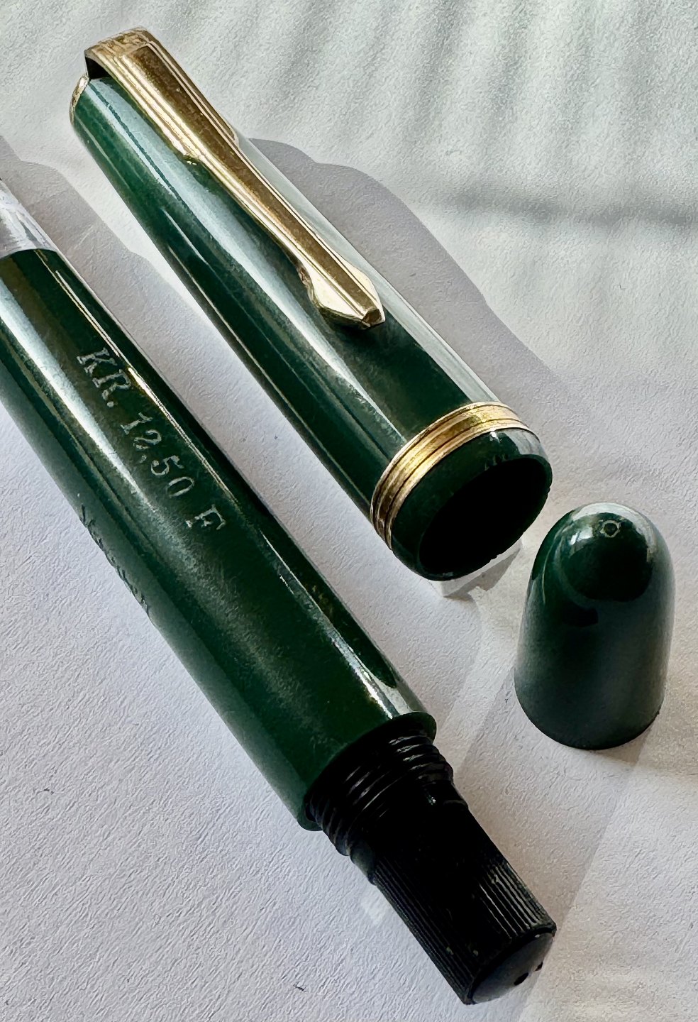 En vintage fyldepen klar til at blive brugt: Grøn Hoover nr. 783 fyldepen med piston filler blæk-påfyldningssystem. Alle dele originale. Nærmest ubrugt. Længde 12,5 cm.