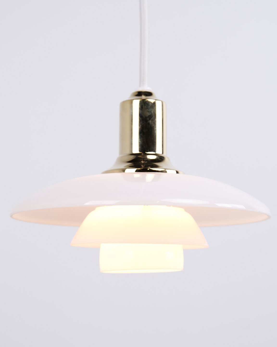 PH 2/1 pendel i messing med opalglas fra Louis Poulsen. Designet af Poul Henningsen med klassisk dansk lysdesign og blændfri belysning.