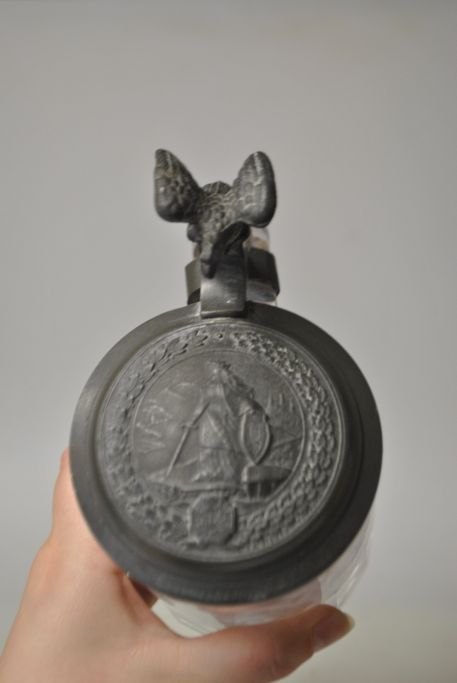 Tysk ølkrus, 1891 i glas med tinlåg. Ælkruset med slibninger. Låg af tin med dekoration af Germania og jernkorset fra 1870/1871. Gæk i form af ørn. På låg indgravering: Peter Asmussen 22 juli1891. Højde.: 15 cm.